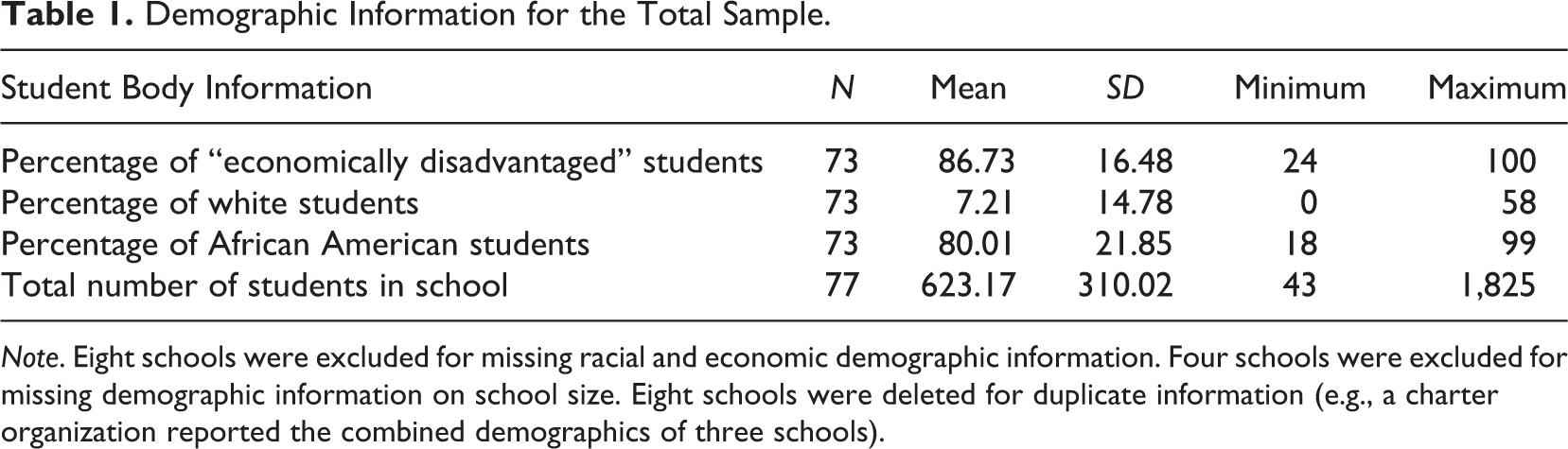The full list extracted from the Enroll Nola website in November 2019 consisted of 105 schools. The first author combined duplicate schools (e.g., French and Spanish tracks of the same school) and removed schools not open for the 2019–2020 year. Additionally, schools charging tuition were removed as private schools are beyond the scope of this inquiry, narrowing the list to 86 schools. This list later increased to 89 schools as the elementary and high school policies of three schools warranted separation due to the vast differences. The racial and economic diversity of each school was obtained from a website run by the Louisiana Department of Education (LDOE, n.d.) called “Louisiana Believes.” The racial demographics included the categories of Native American, Asian, African American, Hispanic/Latino, multiple races, Pacific Islander, and white. Economic disadvantage was defined by the LDOE as students “eligible for Supplemental Nutrition Assistance Program (SNAP), Temporary Assistance for Needy Families (TANF), Medicaid, awaiting foster care, migrant, and incarcerated children” (LDOE, 2015, p. 6). The demographic information of the sample is reported in Table 1.