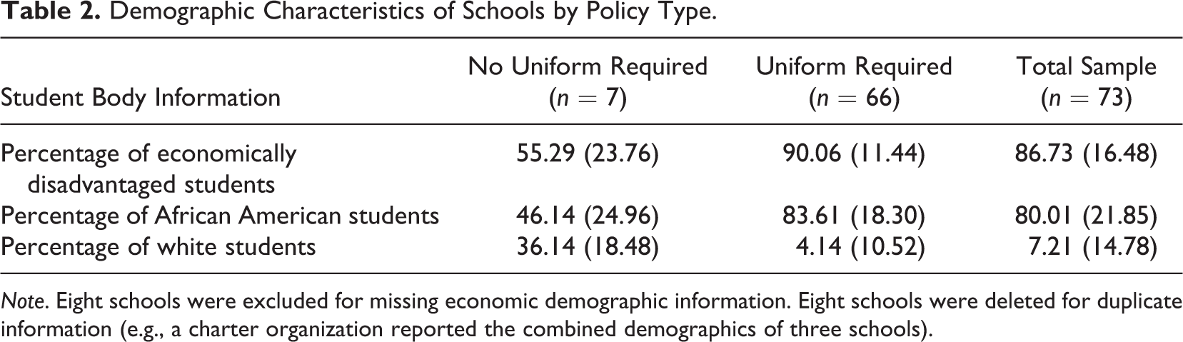 Another common justification for dress code policies was to promote self-expression and creativity. Unsurprisingly, these justifications were more common in schools without uniforms. In fact, six of the schools that utilized a dress code instead of a uniform policy explicitly justified this choice as an effort to encourage student expression. Some uniform schools advocated for self-expression within limits, as one high school stated “Within our uniform guidelines, students are still able to be creative, have fun, and express themselves through appropriate accessories and uniform options.” In contrast, some schools explicitly suppressed creativity in dress, as two PK–8 schools explained, “Your child will have opportunities to express his/her individual tastes, but not via his/her uniform.” These schools did not elaborate on other available forms of expression. In this sample, schools with a higher percentage of students classified as economically disadvantaged, a higher percentage of African American students, and a lower percentage of white students were more likely to enforce uniform policies (see Table 2).