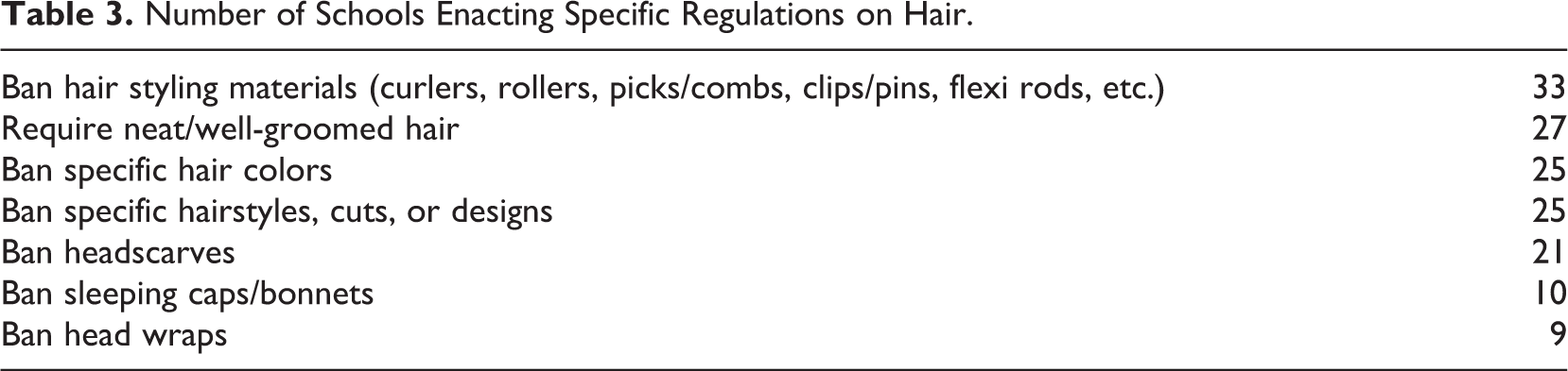 As students in the New Orleans public charter school system are predominantly black, this inquiry focuses primarily on policy implications for black students. Like many policies meant to regulate blackness, race was never mentioned, but the racial coding was clear. Items (headscarves) and hairstyles (designs carved into hair) commonly worn by black students and important symbols of cultural pride (picks) were explicitly banned. See Table 3 for a full list. In addition to these bans, hair could not be extreme/exaggerated, trendy, or distracting, and hair must look natural, professional, modest, appropriate, acceptable, and in one case, “safe.” A few schools took hair regulations to extremes. One school banned