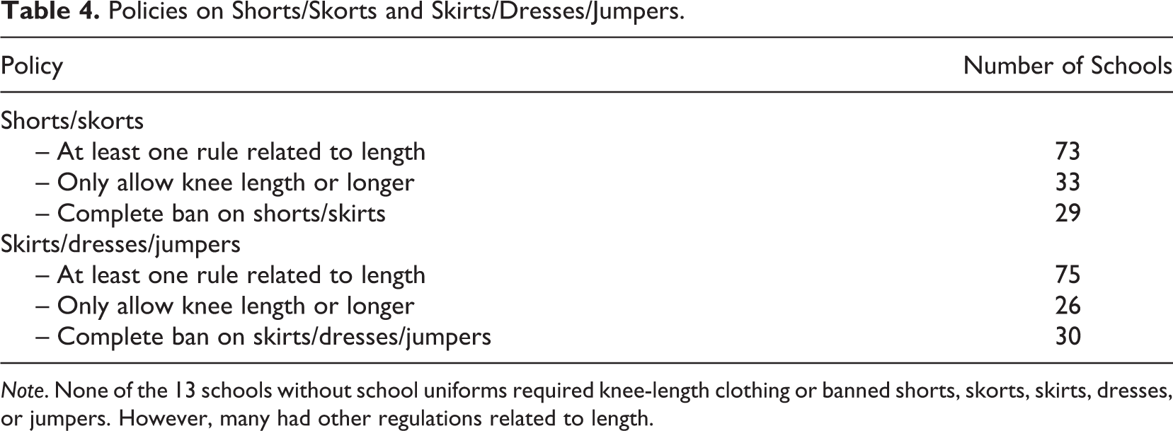 These policies disproportionately targeted attire typically associated with female students. Jewelry, purses, makeup, and perfume were highly regulated, with over 75% of schools including at least one rule related to jewelry. The acceptable amount of skin shown was extremely detailed, sometimes down to the inch. Particularly, the amount of leg shown was a major focus (see Table 4). Despite the fact that school uniforms cover shoulders and midriff, many schools took an extra step to ban these areas, usually through regulations for dress down days. Dress codes were particularly concerned with fit as well as modesty. Tight clothing (25) and leggings (34) were commonly banned. Modesty was regulated through cleavage and low-cut top bans (17) and revealing/suggestive clothing (13). As female students are more likely to wear the majority of these items, the intended audience of these policies are clear.
