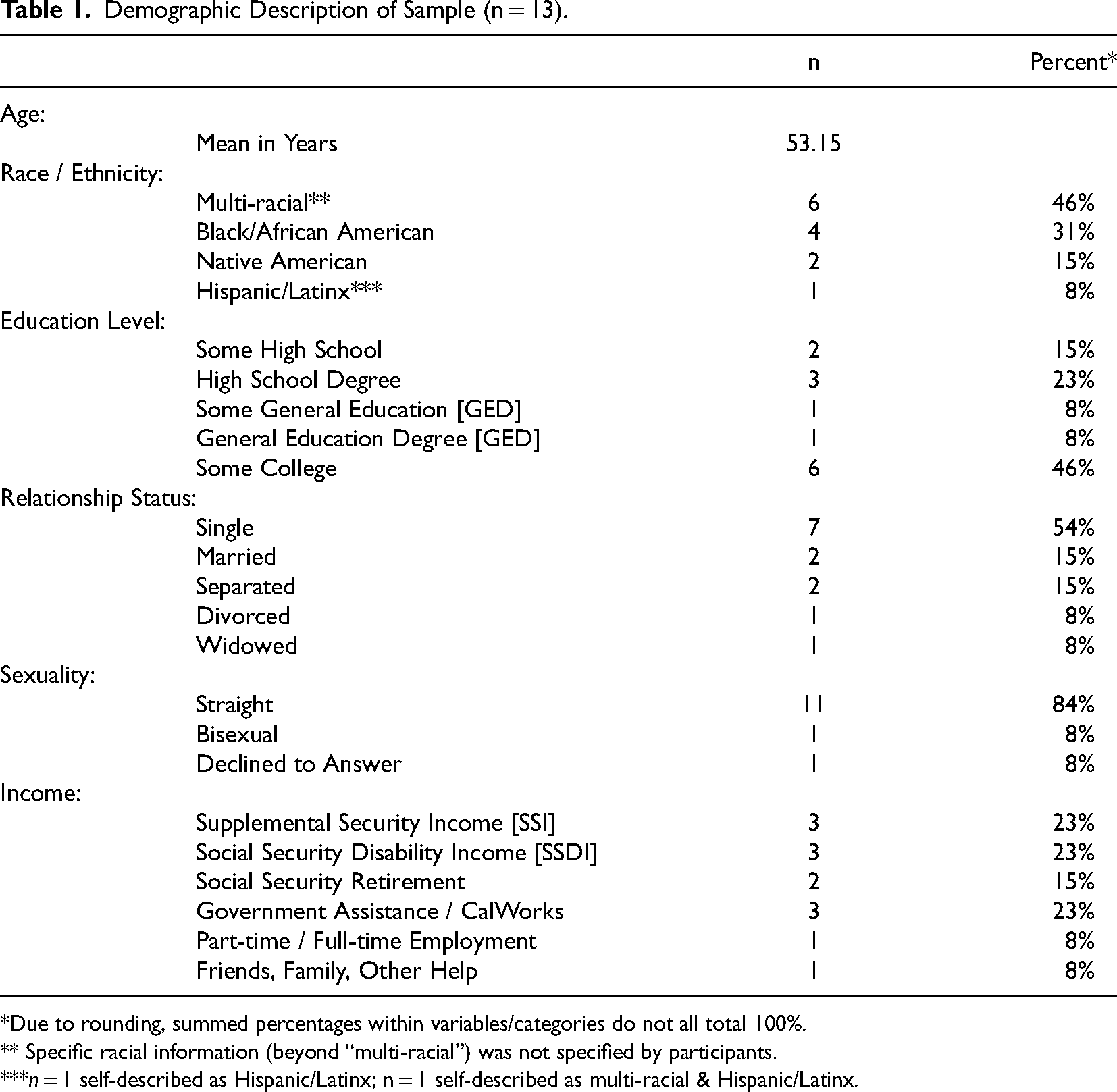 The first interview collected demographic information, summarized in Table 1, including participants’ age, race / ethnicity, education, relationship status, sexuality, and income. Participants’ mean age was 53.15 years. Most identified as multi-racial (n = 6), while others identified as Black / African American (n = 4), Native American (n = 2), or Hispanic / Latinx (n = 1). Education levels ranged from some high school experience (n = 2), a high school degree (n = 3), some general education (GED; n = 1), a general education degree (GED; n = 1), and some college (n = 6). Most were single (n = 7), with others married (n = 2), separated (n = 2), divorced (n = 1), or widowed (n = 1). Eleven participants identified as straight (n = 11), one identified as bisexual (n = 1), and one declined to answer (n = 1). Most relied on government income sources like Supplemental Security Income (SSI; n = 3), Social Security Disability Income (SSDI; n = 3), Social Security Retirement Income (n = 2), and CalWorks (n = 3). One participant worked full-time (n = 1), and another relied on financial support from friends and family (n = 1).