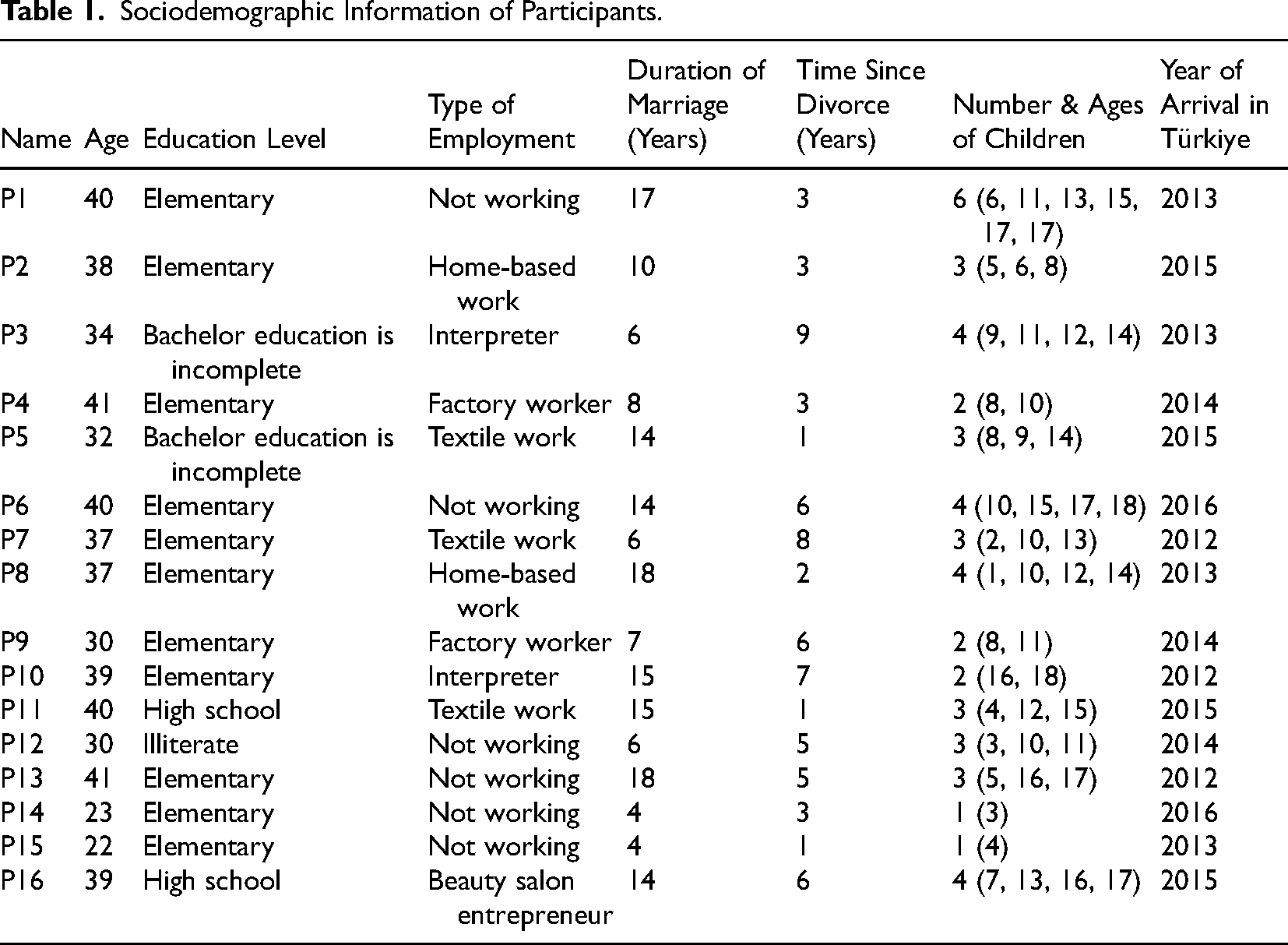 This study investigates the challenges faced by Syrian refugee women in Türkiye during and after divorce, along with their empowerment strategies for rebuilding their lives. A qualitative research design was employed, using purposive sampling and in-depth interviews. Hermeneutic analysis guided the data interpretation (Patton, 2002). The selection of Gaziantep province was based on two key factors: the large Syrian refugee population and the first researcher's prior professional experience working in the region. This experience as a social worker at an NGO in Gaziantep (2017–2022) facilitated access to the research community. Through these networks, eight participants were recruited, while eight additional participants were identified using snowball sampling (Patton, 2002). The socio-demographic characteristics of participants are presented in Table 1. The study focused on divorced Syrian women, all of whom had children.