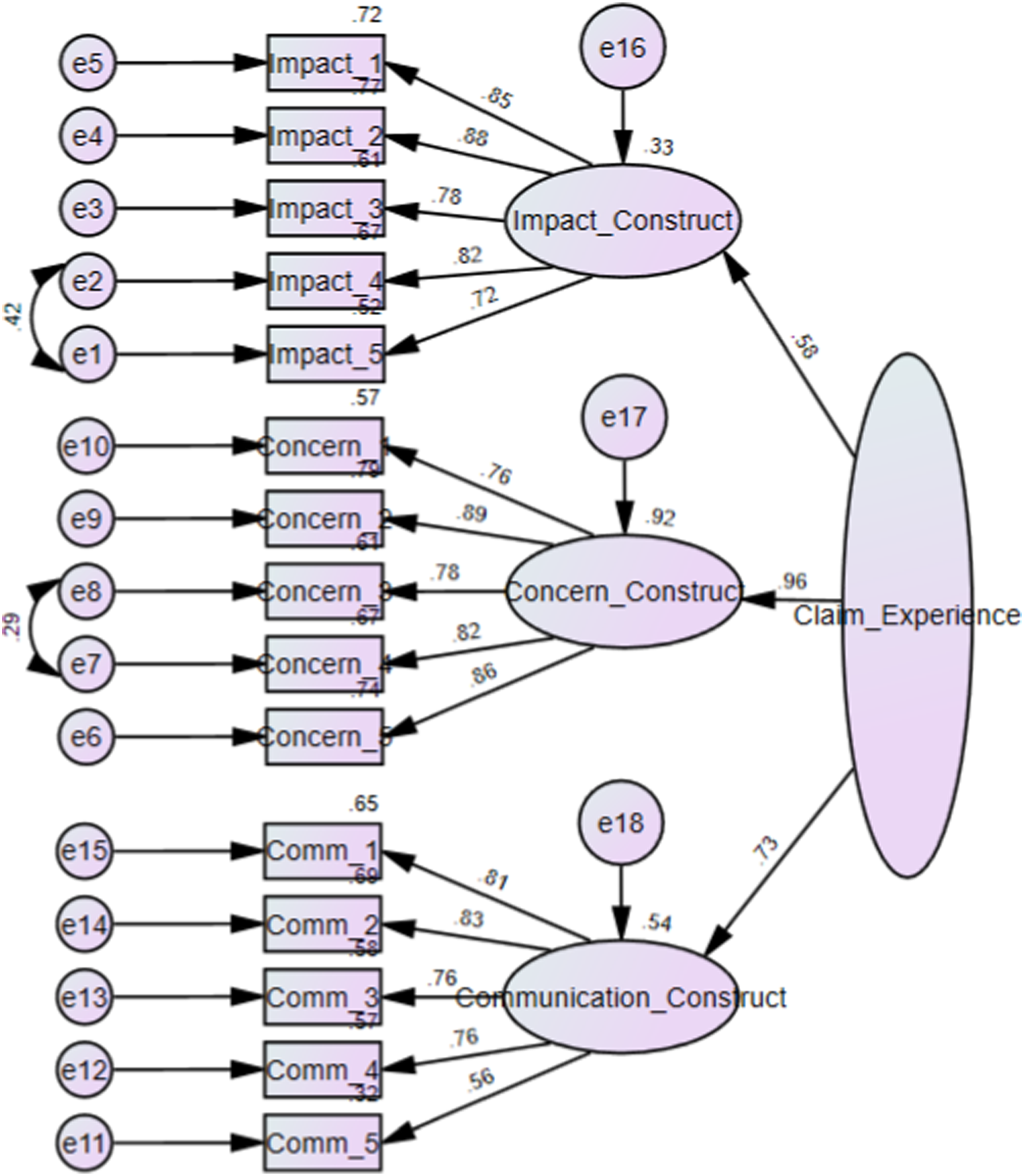 To establish the workers' compensation experience scale, we conducted a second-order Confirmatory Factor Analysis (CFA). The initial results had a chi-square/degree of freedom result over 5.0, and the chosen fit indexes were below .90, which indicated a poor model fit. The modification index was compared to the required values of TLI and CFI. Two items had covariance loadings on the error term above 4.0, so we covaried items 4 & 5 on claims impact and items 3 & 4 on the concern construct, which improved the overall model. Figure 1 includes the covaried loadings on the items. Results of the hierarchical confirmatory factor analysis.