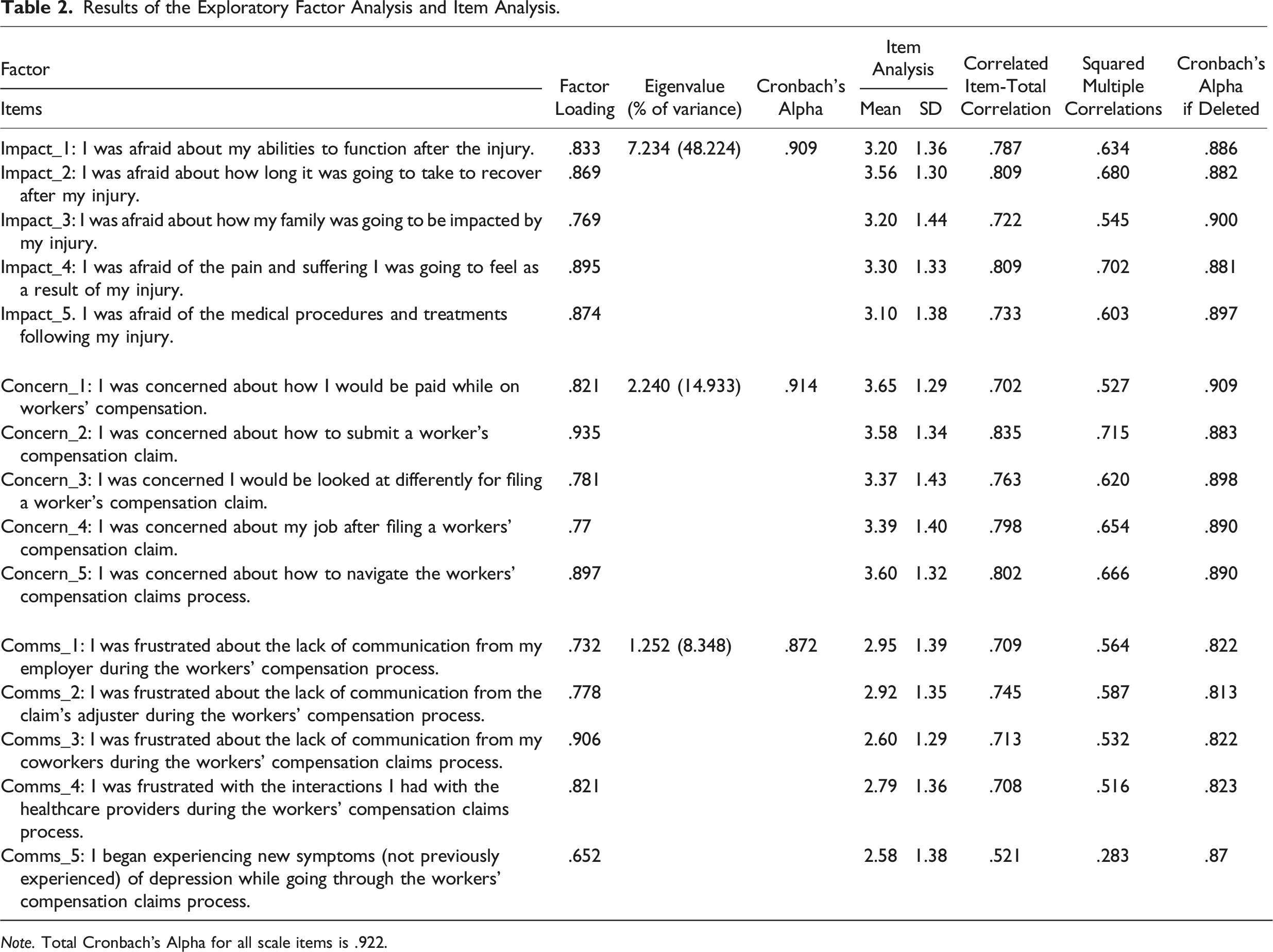 Numerous studies have expanded upon the impact of psychological and emotional harm produced by work-related injuries (Barling & Frone, 2004; Christian et al., 2009; Hilton & Whiteford, 2010). After talking with injured employees, several common themes emerged centered around the concern, frustration with communications, and stress from the impact of the injury. Since no scale exists to measure these dimensions, we constructed a list of factors to consider when creating a new scale.