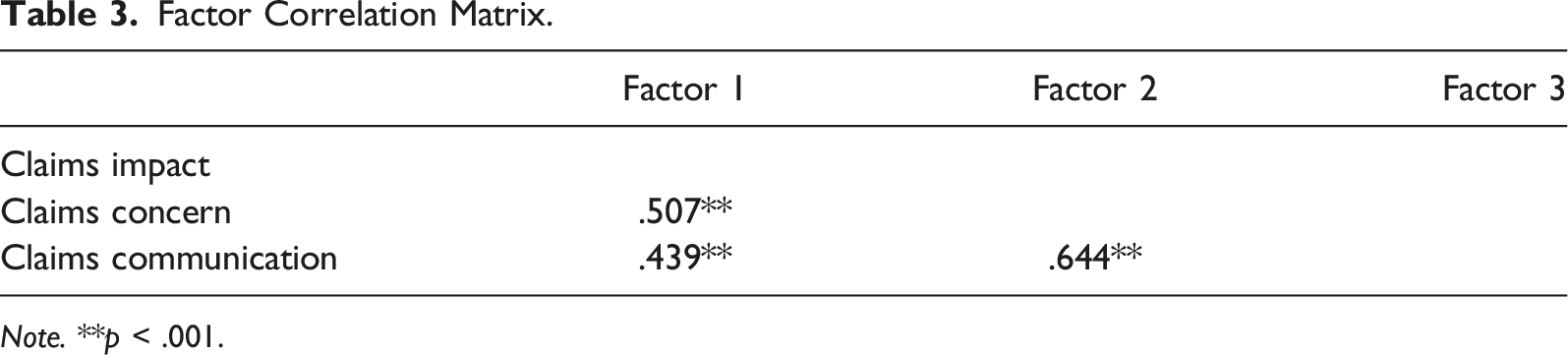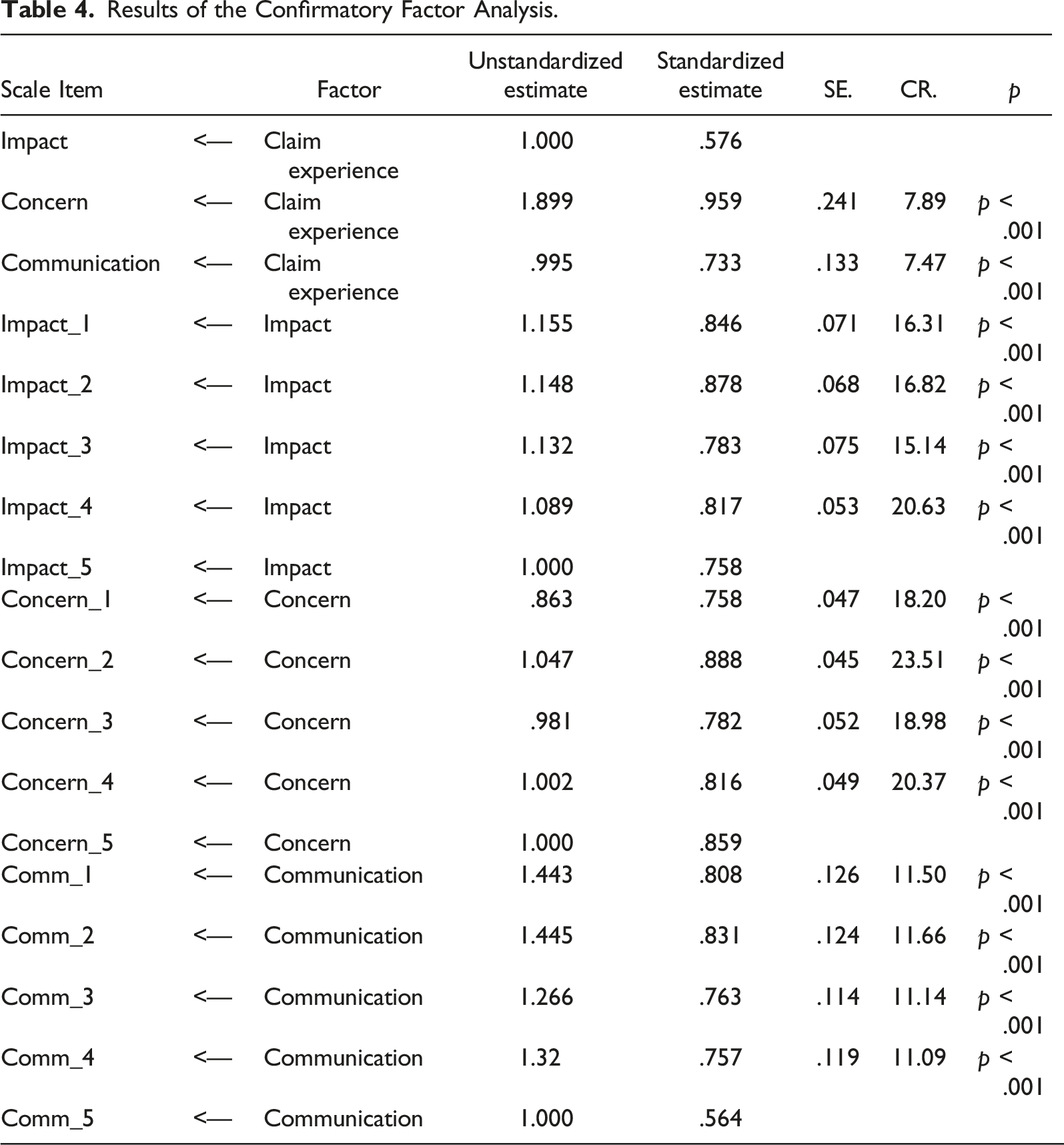 Consistent with theoretical expectations, the results display statistically significant associations between the factors and outcome variables. Claim impact is negatively associated with job satisfaction (r = −.116,