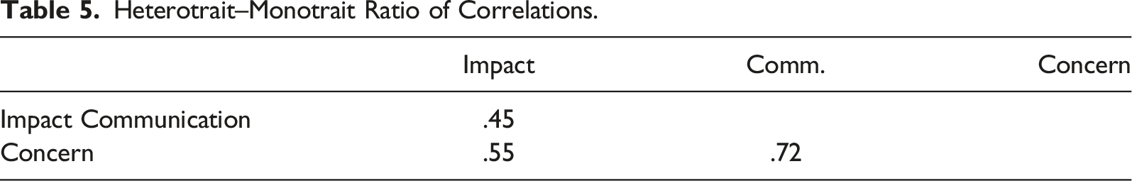 Cronbach’s α was used to measure internal consistency. The alpha scores were good for the three constructs: concern (α = .914), communication (α = .872), and impact (α = .909). The overall scale with all items included is .922. These findings support good internal consistency with the established scale.