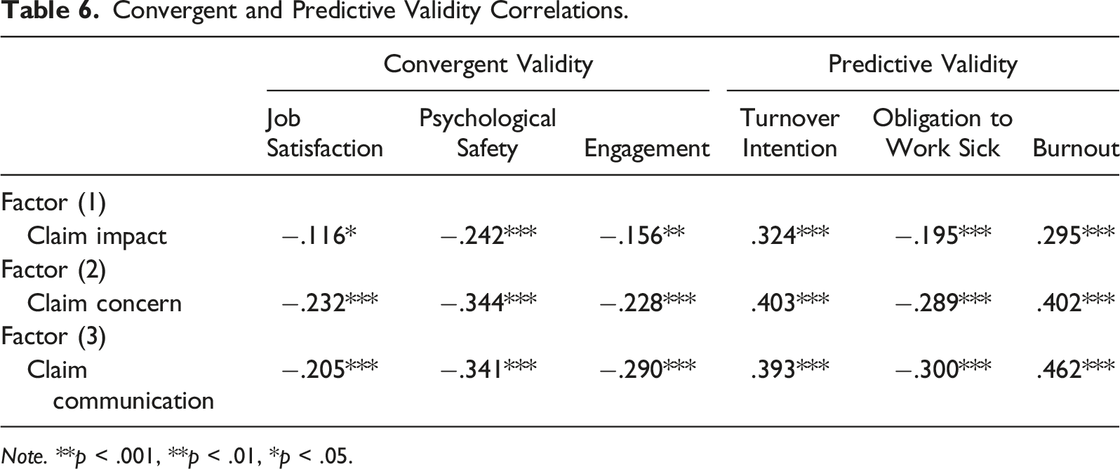 To assess predictive validity, three established employee-related outcome variables were introduced into the model—turnover intentions (Dwivedi, 2015), obligation to work sick (Demerouti et al., 2009), and burnout (Rutherford et al., 2015). The correlation results of predictive validity are found in Table 6. The correlation analysis reports a statistically significant relationship between the posited constructs and the outcome variables. Claim impact is positively associated with turnover intention (r = .324,