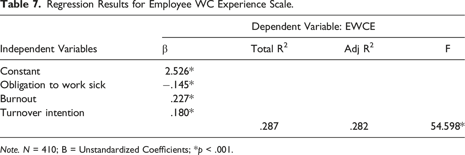 To extend these results (See Table 6), we conducted a multiple regression analysis that examined the relationship of the predictors (turnover intention, obligation to work sick, and burnout) to the dependent variable (EWCE). The model’s R-squared is .287, implying that the predictors explain approximately 28.7% of the dependent variable's variance.