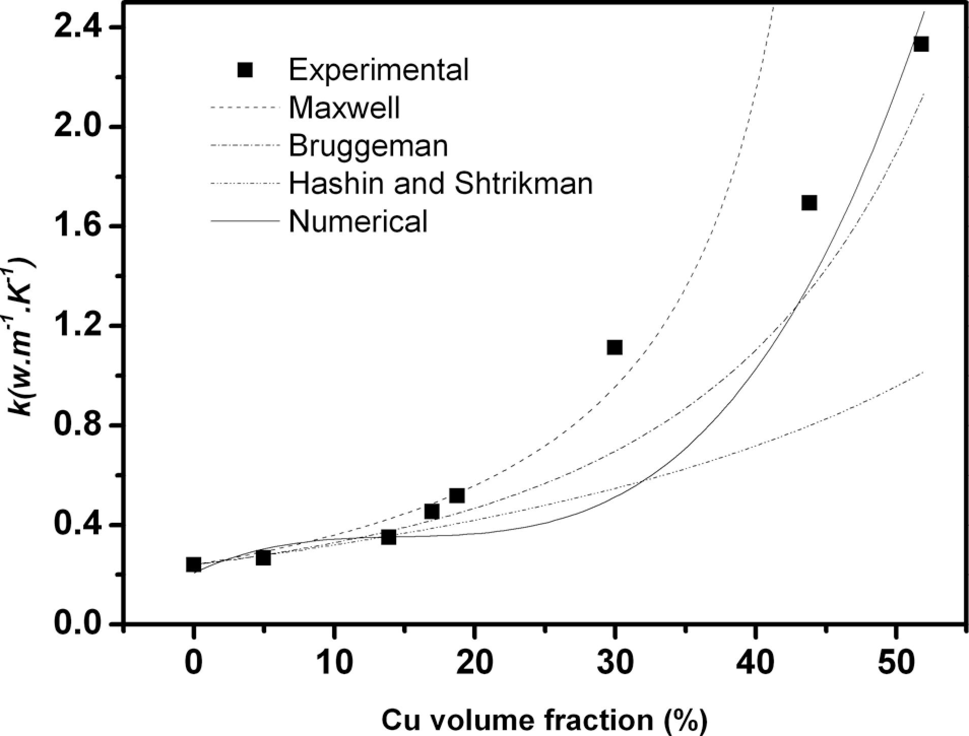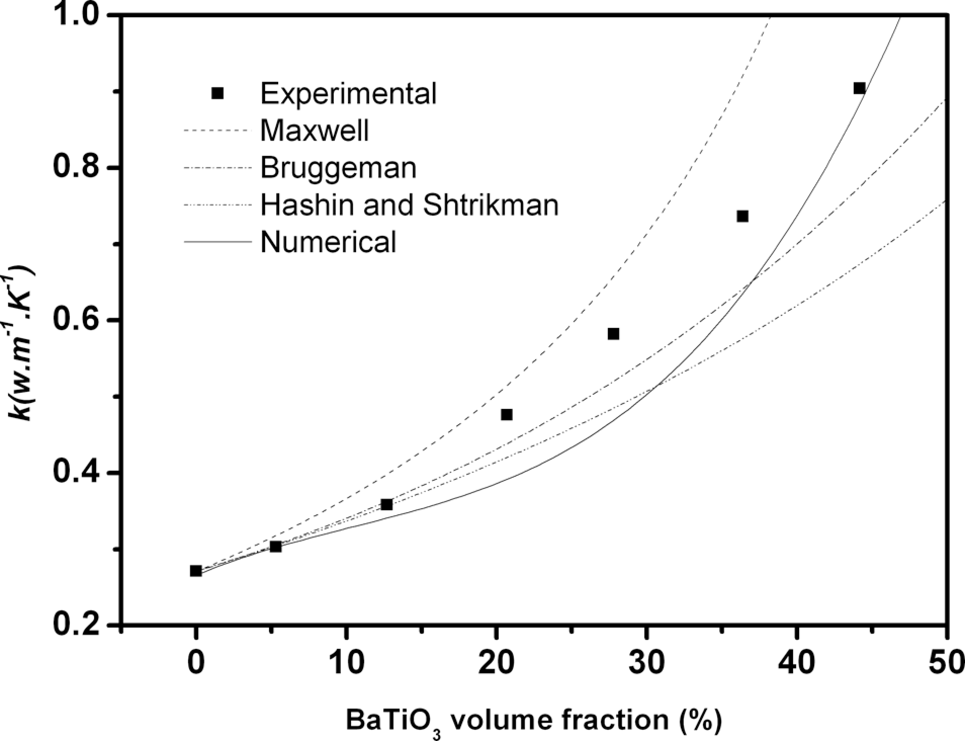 Several models have been proposed in the literature regarding the thermal conductivity of particle filled composites as a function of filler content and a number of researchers have tried to fit their experimental and numerical data with the various models. 19 The main idea of this article is not to present a large review of the analytical models of the thermal conductivity of composite materials, but we have focused only on three analytical models that are widely used in the literature for comparison with the experimental data. Moreover, several references 5,11 were given in the article so that the reader can easily get with more details relating to the kind of models, their order and their application domain. In this study, we found that our numerical points shown in Figures 2 and 3 could fit very well with models such as the Maxwell, the Bruggeman and the Hashin and Shtrikman.