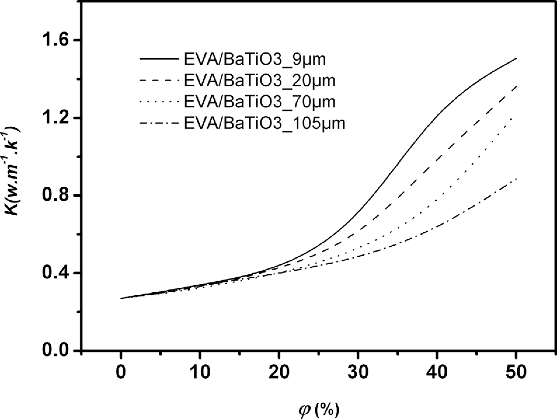 Effect of particle size of barium titanate (BaTiO3) on thermal conductivity of composites.