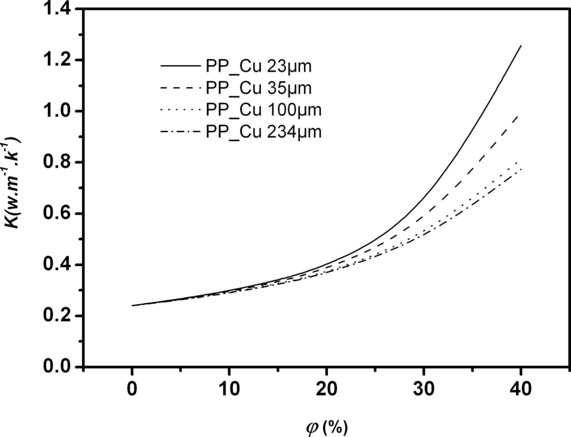 This result was also described by several authors for other particle filled polymeric matrix. Boudenne et al. 18 investigated the effect of particle size on the thermal conductivity of PP matrix filled with spherical particles of Cu. They found that the particle size has an effect on the thermal conductivity. The numerical results relating to the estimation of the thermal conductivity variation in terms of the function of size of Cu particles and concentration of PP matrix are shown in Figure 5. It can be seen that the use of larger particles is an effective way of decreasing the thermal conductivity of composite.