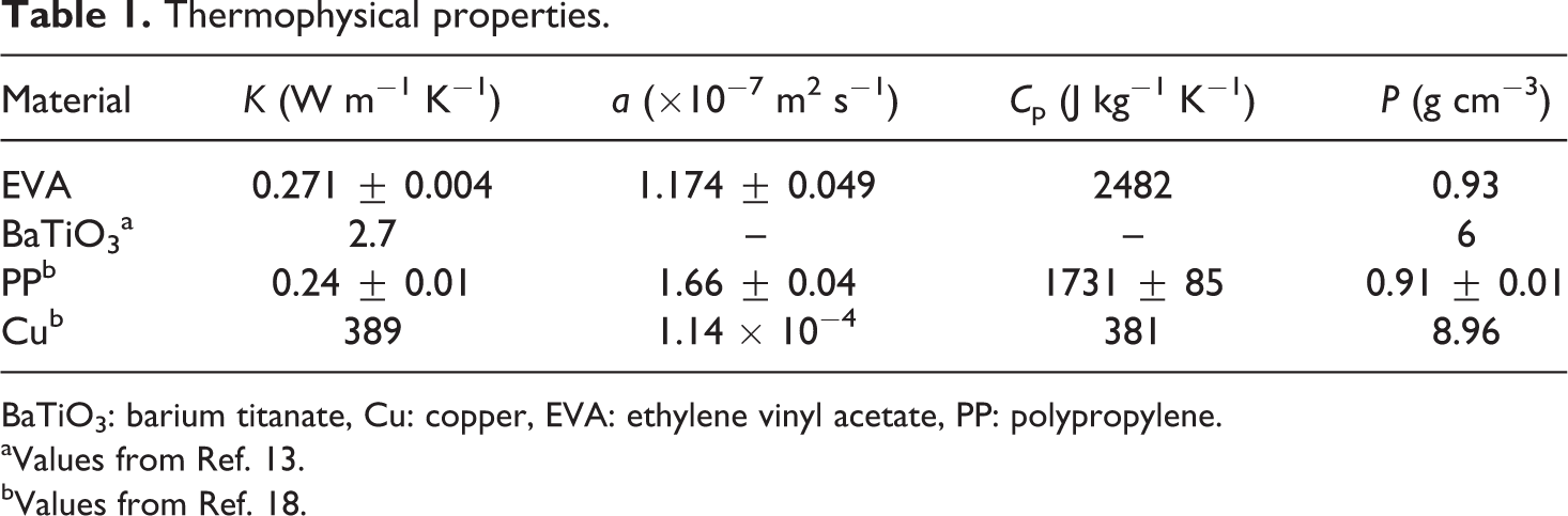 For thermal conductivity measurements, specimens with dimension of 44 mm × 44 mm × 3 mm were performed at room temperature. The preparation method and the thermophysical characterisation of the composites were presented in our previous articles. 13 ,18 The properties of the polymers and the particle fillers can be found in Table 1. 13 ,18