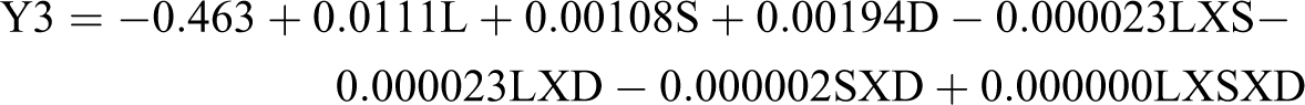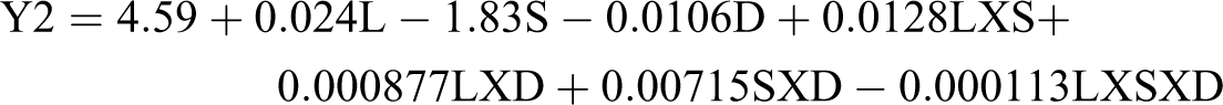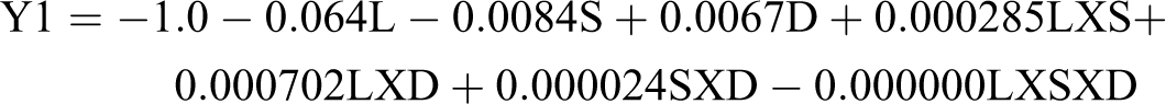 Table 6 shows the experimental conditions selected for the confirmation tests. Table 7 shows the results obtained from the tests, and a comparison is made between the computed values from the regression model developed in the present work (equations (1), (2) and (3)) and the values obtained experimentally.