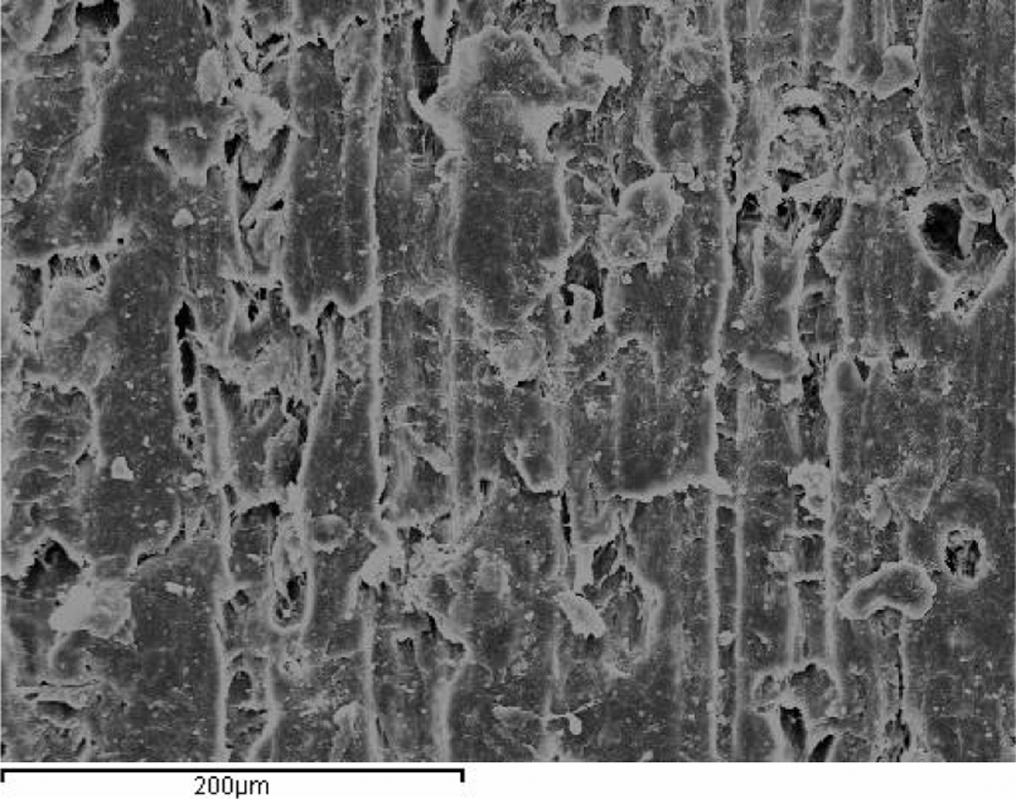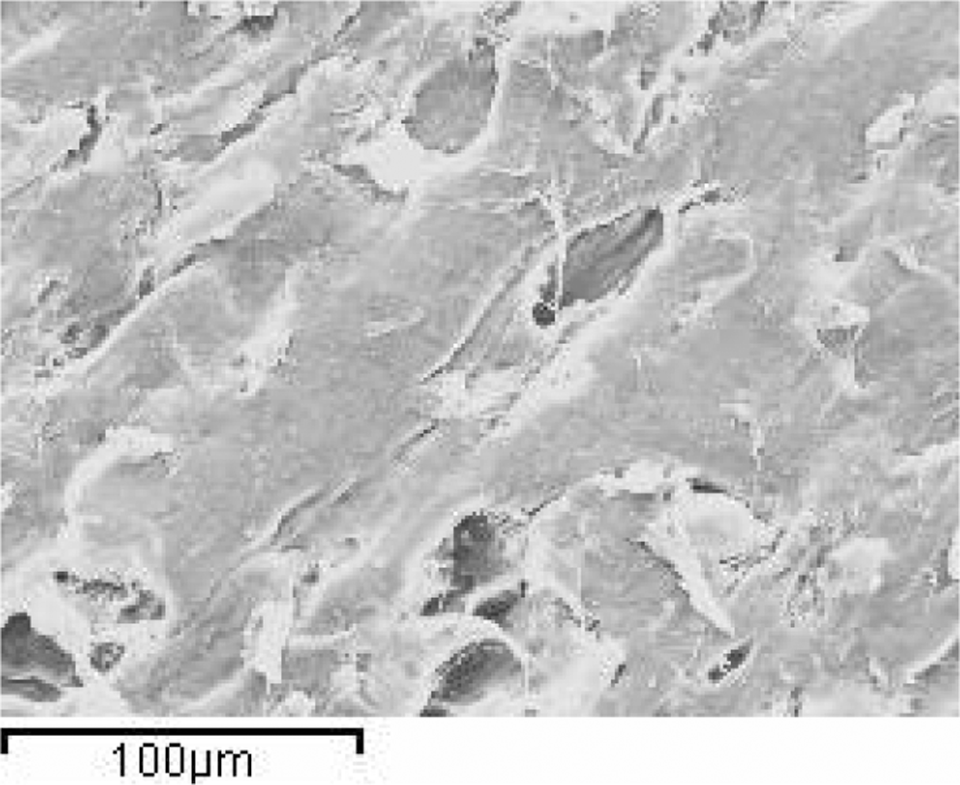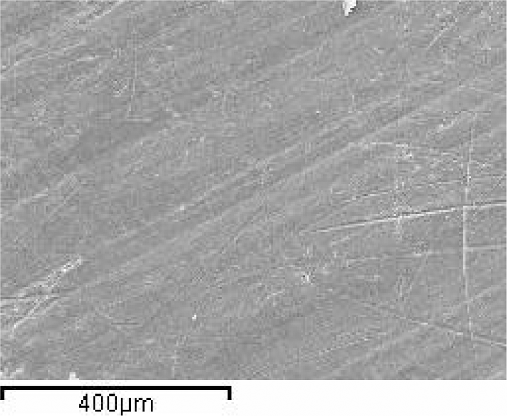 The SEM images of worn surfaces of the PTFE composites filled with 40% bronze under load conditions are shown in Figures 10 and 11. It is seen that there is an obvious tribolayer on the counterface of the PTFE composites under these loading conditions. However, the transfer films formed with the PTFE composites filled with glass and bronze particles are thinner and more uniform than those formed for the virgin PTFE composites. This reveals that fillers such as glass particle enhance the adhesion of the transfer films to the surface of the PTFE + 25% glass particle and PTFE + 40% bronze composites. Therefore, thin and uniform transfer films largely decrease the wear of the PTFE composite. It is noticed that PTFE + 40% bronze powder formed on the counterface are thinnest and most uniform. This reveals that the adhesion strength between the transfer film and the counterface is strong. The tribolayers formed on the counterpart for the PTFE composite with the virgin PTFE are easily peeled off from the surface of the counterpart in dry sliding, but the bronze-filled PTFE composites increase the formation ability of the tribolayer, and the adhesion of the tribolayer to the counterface is as shown in Figure 10. Therefore, the friction and wear properties of PTFE + 40% bronze composites are the best under these conditions.