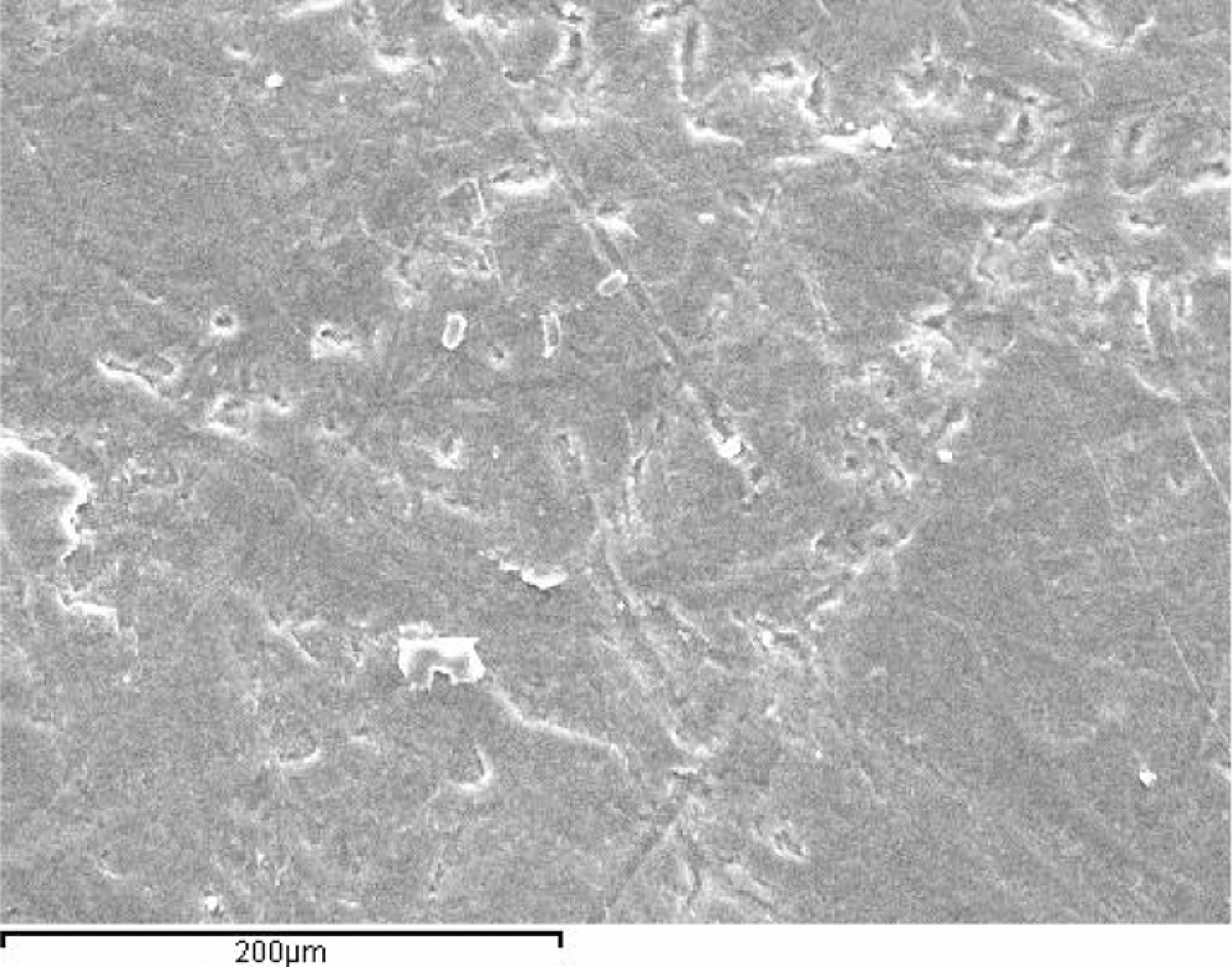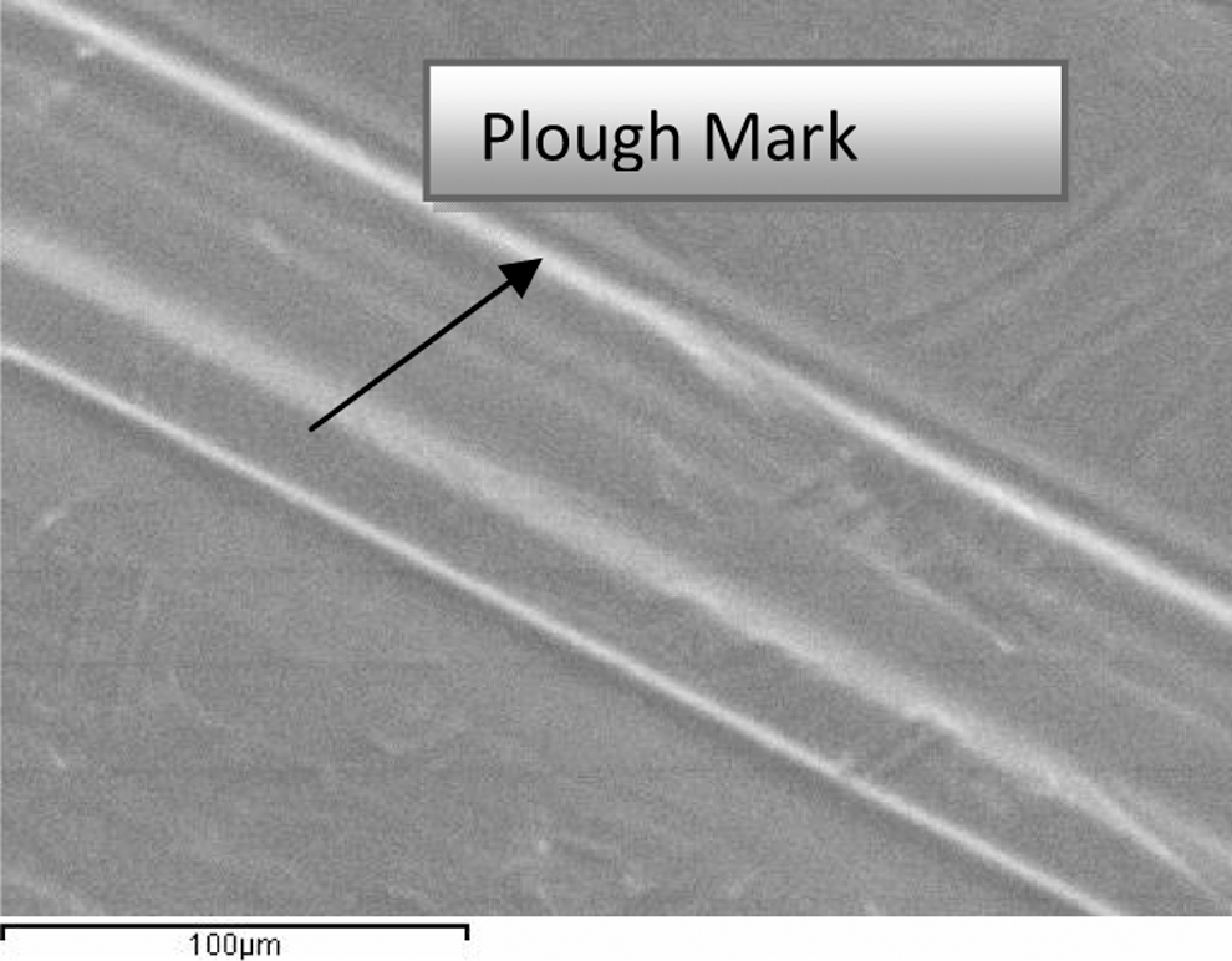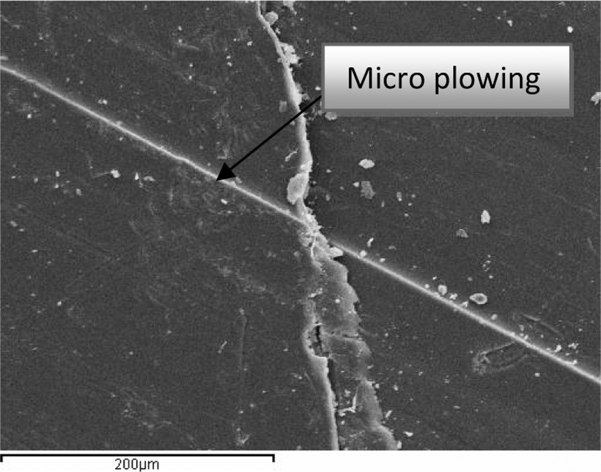 The worn surfaces of the virgin PTFE appear smooth, the worn surfaces of the unfilled PTFE show very slightly ploughed marks, which can be seen from Figure 3. This indicates that adhesion is the dominant wear mechanism of unfilled PTFE. However, in the case of the composites, the presence of the filler materials in the PTFE matrix impedes the film buildup process, resulting in a wear debris particle smaller in size than the virgin PTFE. When the load is increased from 20 to 60 N for the same material, more wear rate occurs and the effect of micro-cracking and delamination on the disc track surface of unfilled PTFE due to the sliding contact and Hertz pressure of the pin of SAE 1045 steel for the load 60 N can be clearly observed from Figure 5. In Figures 6 and 7, the process of wear by micro-plowing and micro-cutting in the PTFE with 25% glass particles can be observed. The presence of the glass particles makes it difficult to wear by micro-plowing and micro-cutting. However, we can observe little amount of wear debris patches attached to the surface of the PTFE + 25% glass particle composites. If the filler or environmental conditions are too abrasive, rapid wear will occur through ploughing. The entrapment of wear debris can have a similar effect. It has been suggested that chemical reactions at the interface may be important. As is well known, the tribological properties of polymers and their composites sliding against a metal under friction conditions are strongly influenced by their ability to form a transfer film on the counterpart surface. Once a transfer film is formed, subsequent interaction occurs between the polymer and a layer of similar material, irrespective of the composition of the substrate. 16