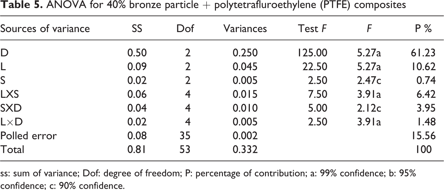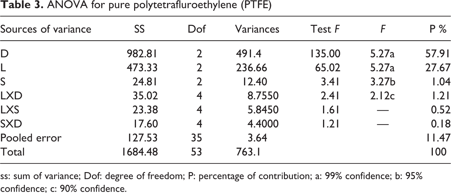 The ANOVA allows analyzing the influence of each variable on the total variance of the results. Table 3 shows the results of ANOVA of dry sliding wear of pure PTFE test samples. This analysis was performed with a level of significance of 1% that is for a level of confidence of 99%.13,14