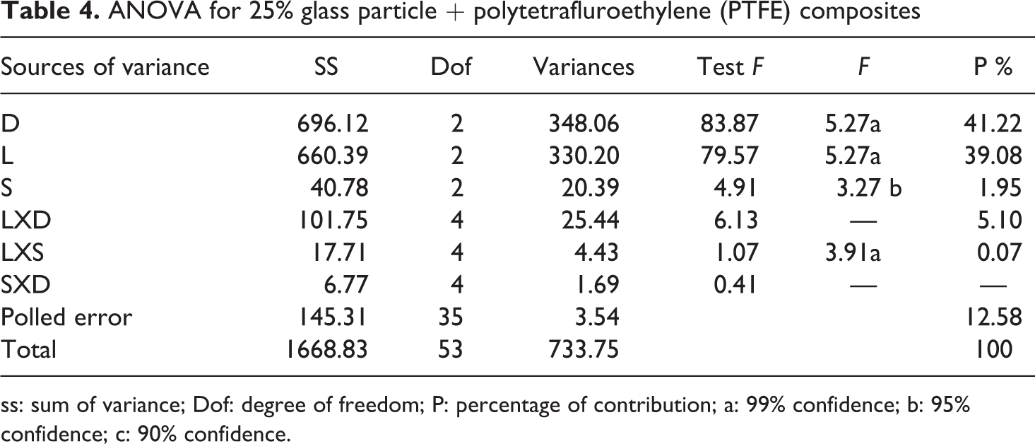 ANOVA for 25% glass particle + polytetrafluroethylene (PTFE) composites