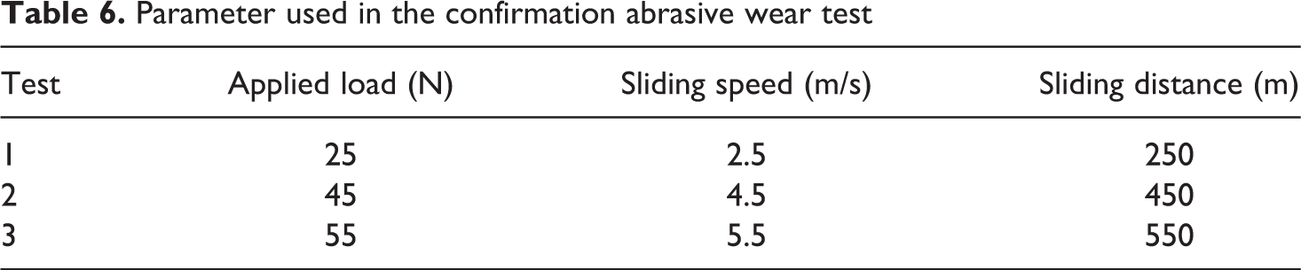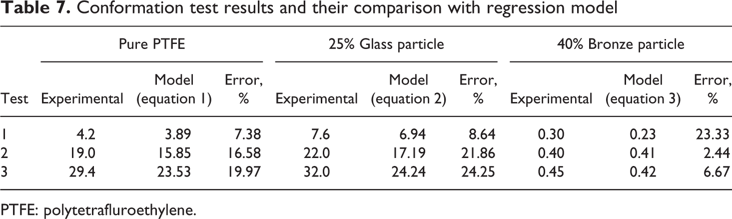 The confirmation tests showed that the error associated with pure PTFE (maximum value 19.97% and minimum 7.38%), for 25% glass particle + PTFE composites (maximum value 24.25% and minimum 8.64%) and for 40% Bronze particle + PTFE composites (maximum value 23.33% and minimum 2.44 %) are excellent.