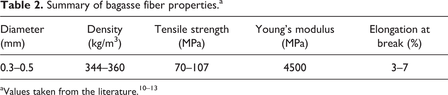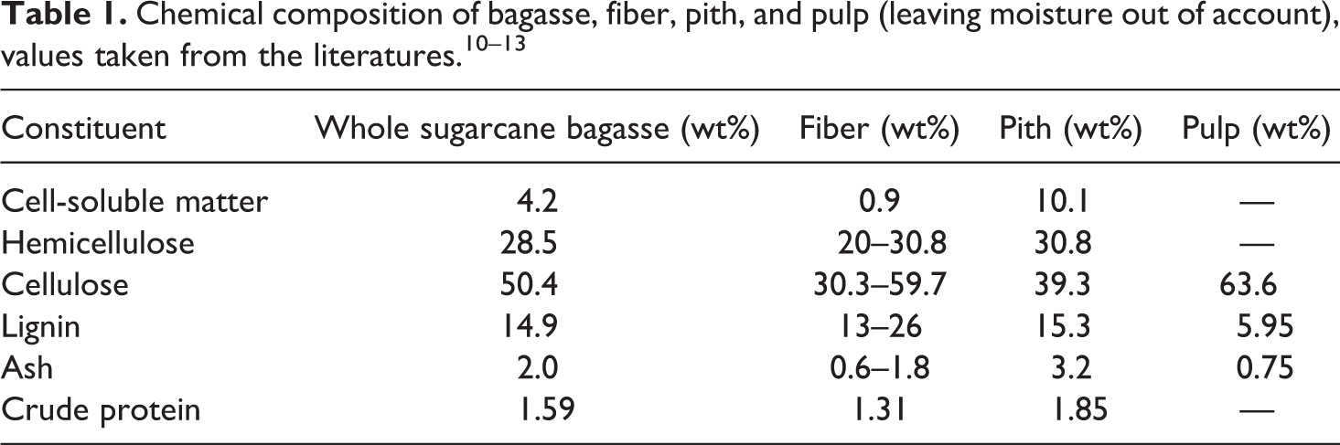The sugarcane stalk is not a uniform material. In general, it consists of an external rind and an internal pith. However, denotations for the term “pith” are not the same. The term “pith” may be used to depict the inner nonfibrous structure, which must be removed before preparing wood–plastic composites. 7 In other literatures, the pith is believed to contain softer, shorter fibers, and the majority of sucrose, while the rind is composed of harder, longer, and finer fibers. 8 Therefore, composites can be reinforced by fibers from either part of sugarcane stalk. The properties of composites reinforced by the pith fiber are lower than that of reinforced rind fibers. 8 However, the two parts are not separated in sugar refineries. Therefore, common bagasse contains both parts. When bagasse fiber is used as a reinforcer, it is roughly treated as a component of sugarcane. The proportion of chemical composition in bagasse depends on the age, source of the fibers, and the extraction conditions. 9 Table 1 presents the general chemical composition of bagasse, fiber, pith, and pulp. Among these, fiber is the most common reinforcer, and its properties are shown in Table 2.