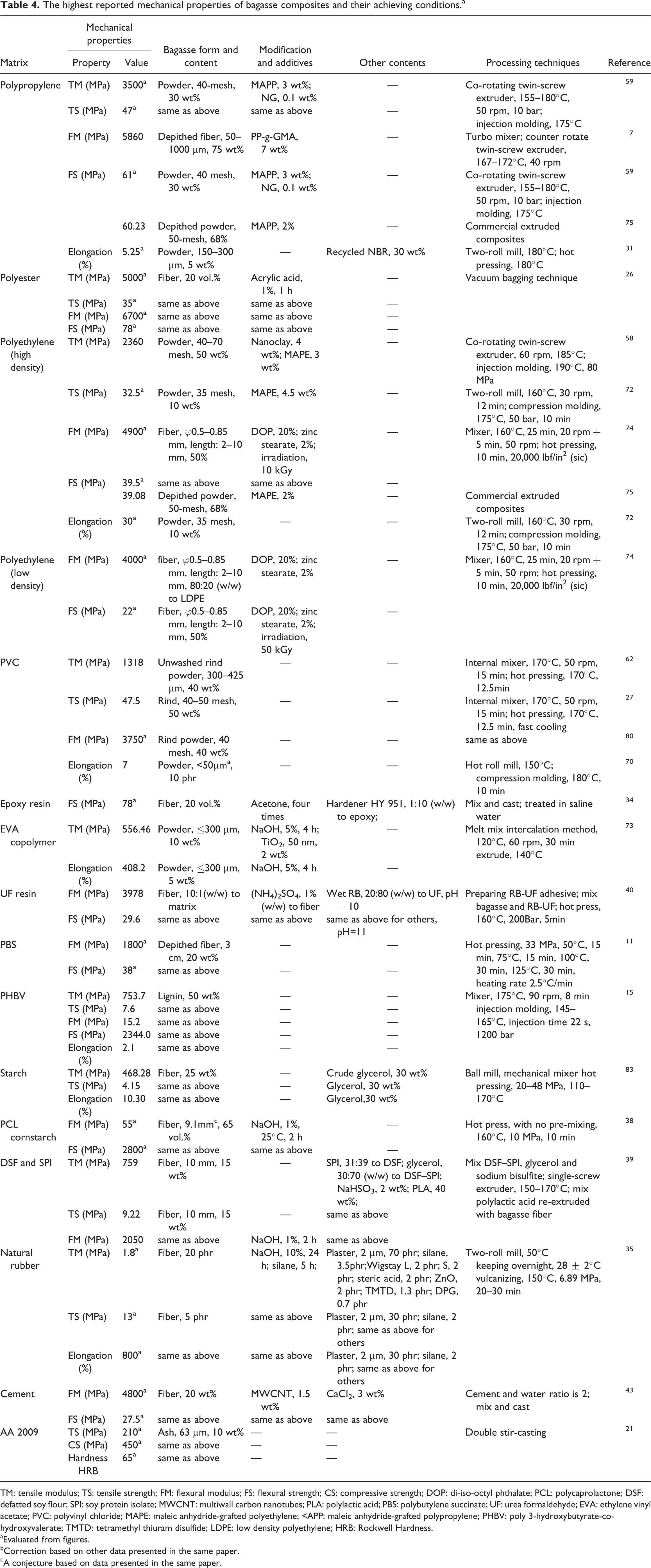 Factors that influence the mechanical properties of bagasse composites have been discussed in the above sections. In this section, Figures 1 to 4 shows the mechanical properties of bagasse composites that are made from several different matrix materials. To avoid overemphasis on references that report more data, the values given in these figures are the average of each paper’s properties. Table 4 summarizes the highest reported mechanical properties of various bagasse composites and their achieving conditions.