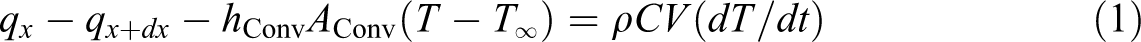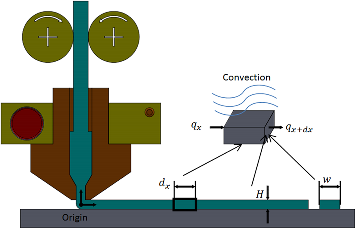 Indeed, it is presumed that the coordinate origin is at the nozzle outlet, and the heat transfer is one-dimensional along the x-axis. The temperature is defined at the starting point of the process and can be measured after a certain distance. Obviously, the element length is equal to