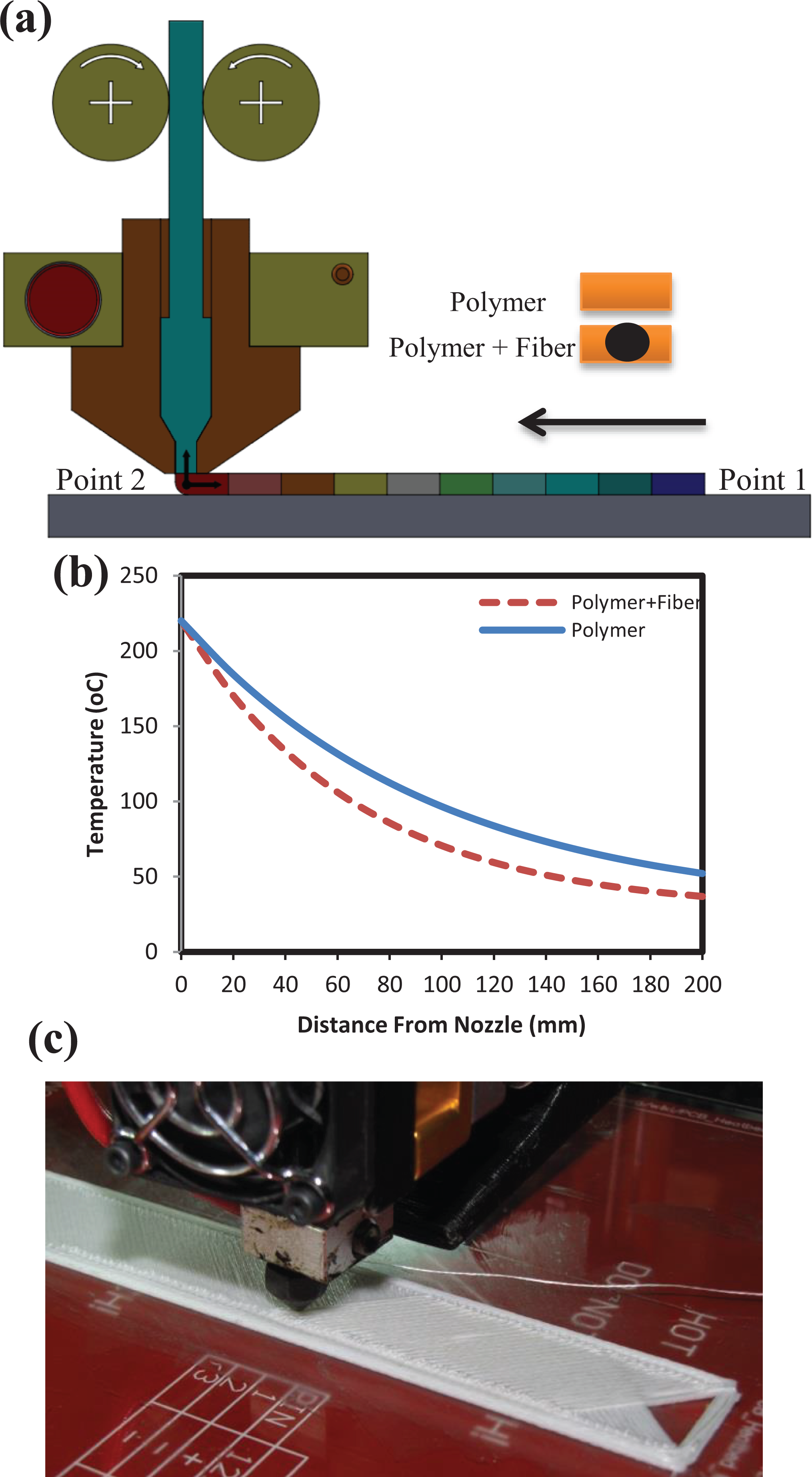 (a) Temperature changes in the deposited raster. (b) Effect of the travel distance from the nozzle on the temperature of the composite and non-composite deposited raster. (c) The 3D printer used in this study.