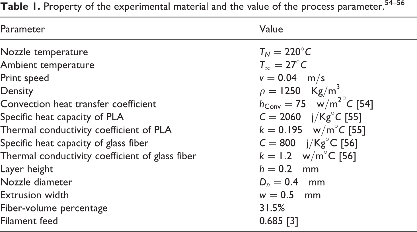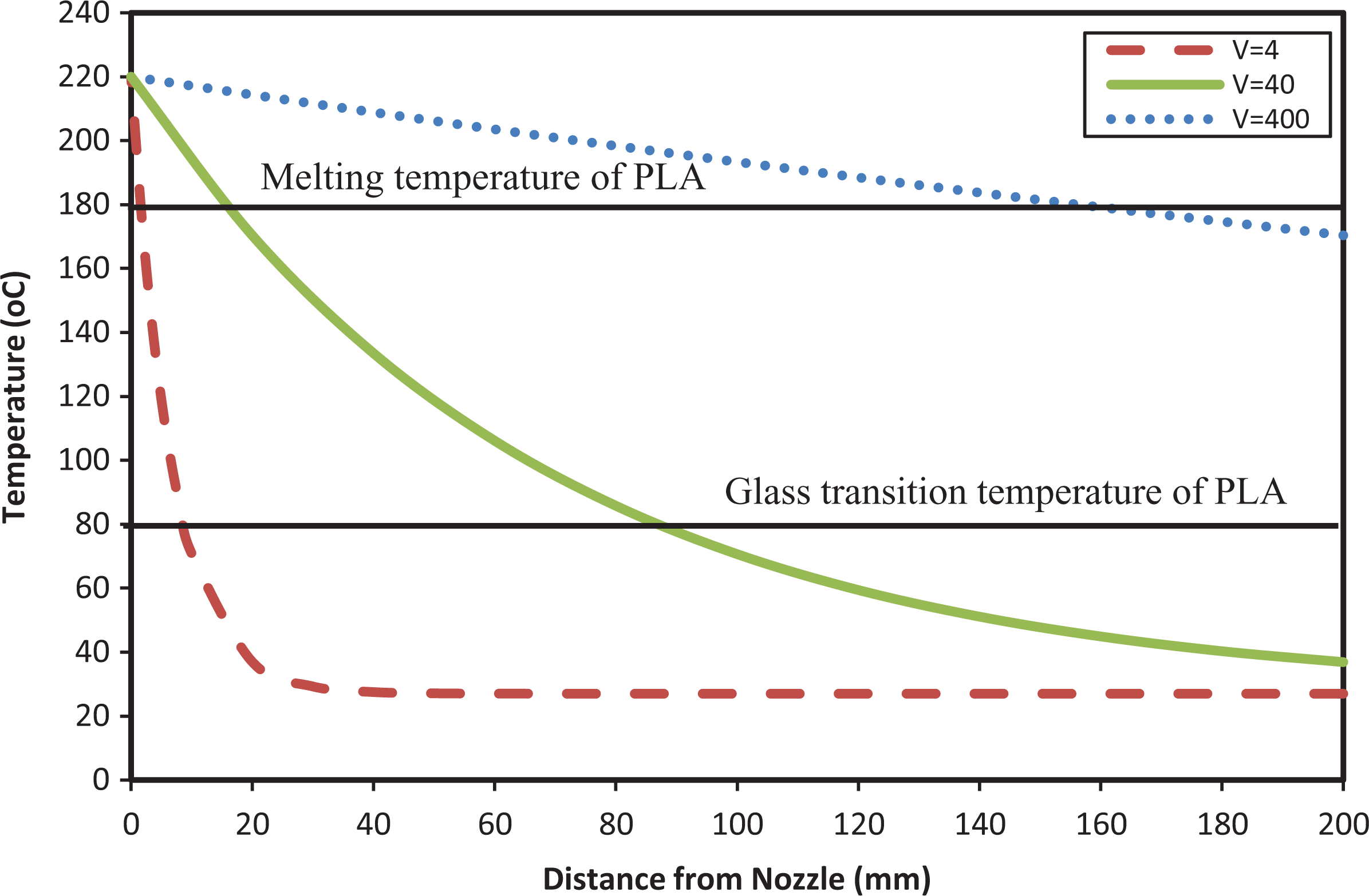 As shown in Figure 2(a), the nozzle starts at point 1, and prints a distance of 200 mm. As the nozzle moves, the temperature of the deposited filament changes according to Figure 2(b) for the neat polymer and composite material. It is observed that in presence of the fibers, the heat transfer rate and the heat loss rises because of the reduction in the polymer. If Equation (2) is solved for different velocities (4, 40 and 400 mm/s), Figure 3 is obtained using the data presented in Table 1 and continuous fibers with 0.2 mm diameter. The data in Table 1 is shown for PLA, and the glass transition and the melting temperature are 80°C and 180°C, respectively.