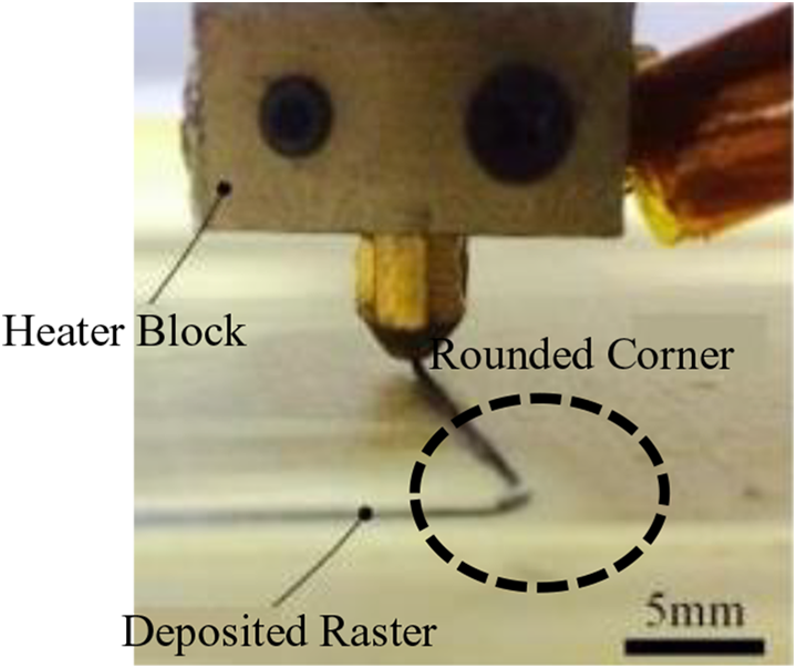 For example, with a printing temperature of 220°C and printing speed of 40 mm/s for a direct path, the temperature reaches below the melting line if the distance equals to 20 mm from the nozzle. By reducing speed to 4 mm/s and assuming that the temperature is lower than the melting line, the distance equals to 4 mm. So, it is necessary to drop the amount of printing speed at the beginning of a curved path to achieve printing process with excellent radius at corners. Also, with lower printing speed (4 mm/s), the radius at the intersection of the two paths is minimized. Otherwise, without a reduction in the printing speed like in Figure 4 that adapted from, 27 the intersection of the two paths have an undesirable radius, and higher printing speeds lead to greater radiuses.
