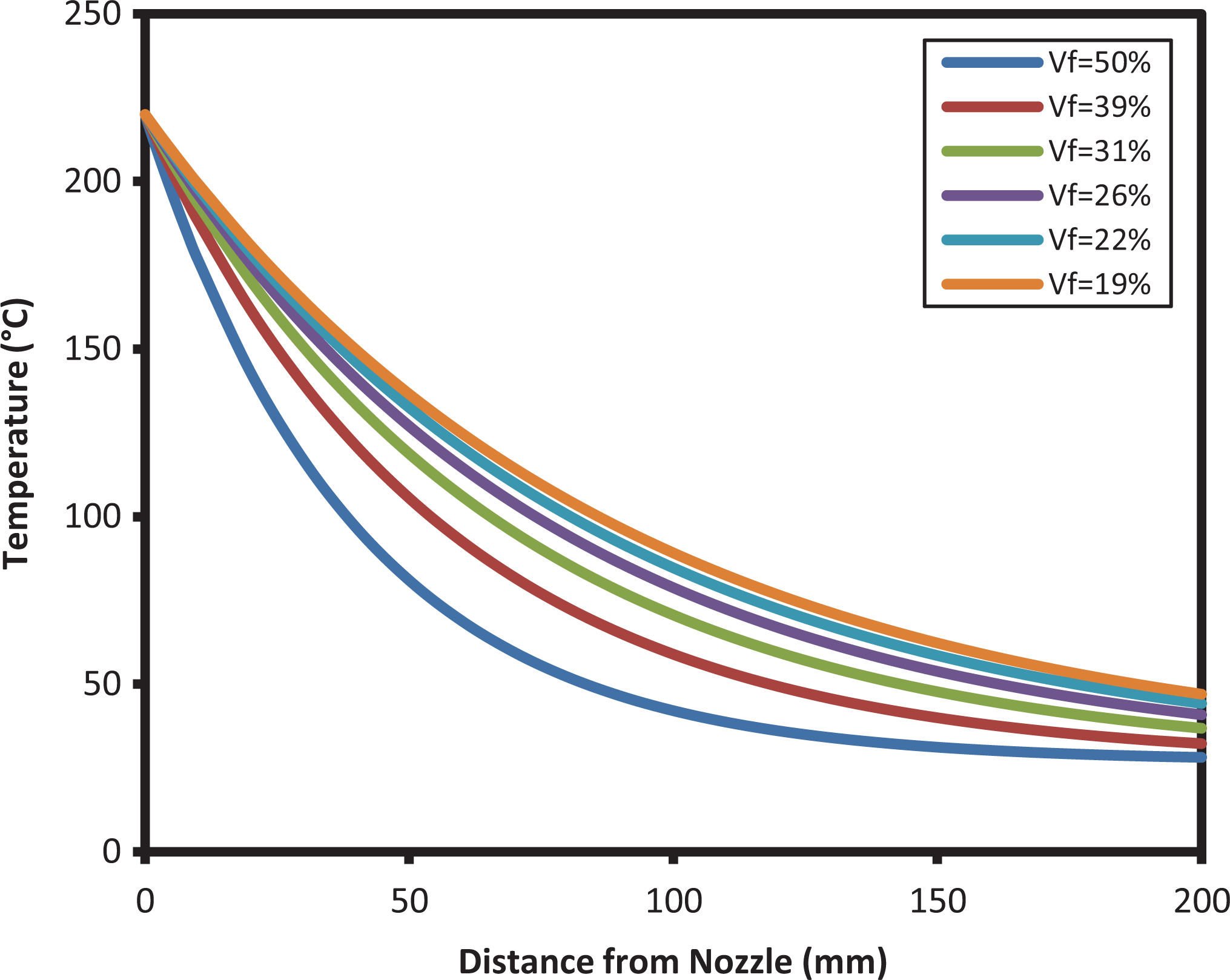 Temperature variations as a function of distance from the nozzle at different fiber-volume percentage.
