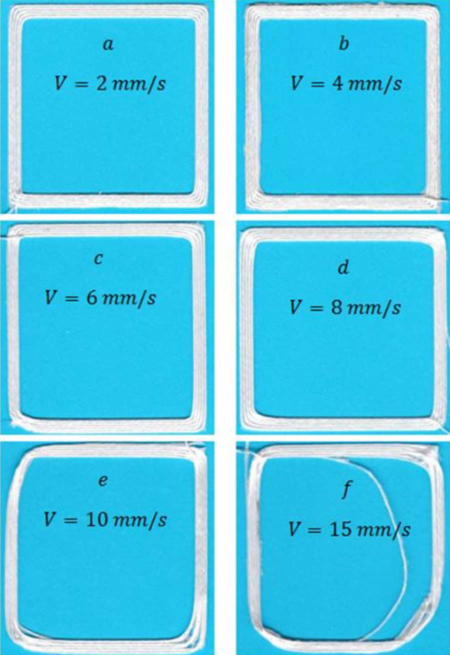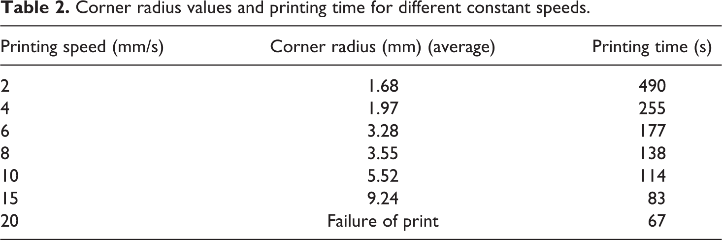 This section investigates the effect of printing speed on the sample’ quality and the radii created at the corners. At first, some squared specimens are printed at 50 mm sides with different printing speeds (2, 4, 6, 8, 10, 15, and 20 mm/s) and various parameters mentioned in Table 1, and then the radii of their corners are measured. Table 2 shows the mean radius created at the corners and the printing time of each sample for all printing speeds. The values are presented for five samples and mean the results are reported.