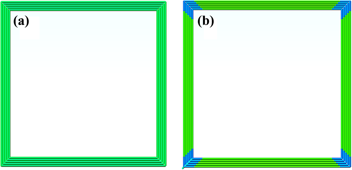 Printing samples at (a) constant and (b) variable speeds in corners.
