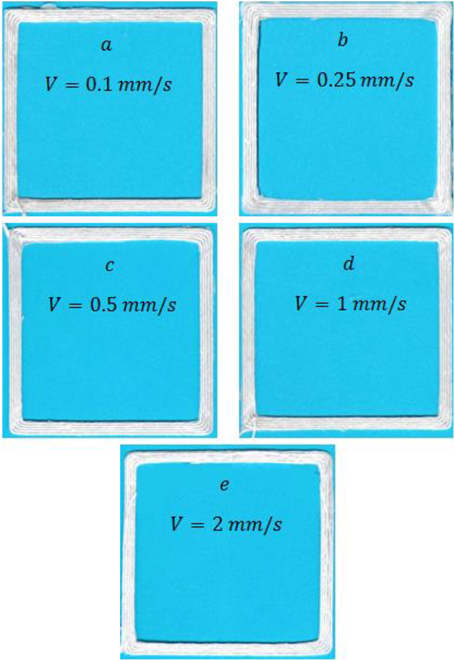 Printed samples at printing speeds of (a) 0.1, (b) 0.25, (c) 0.5, (d) 1, and (e) 2 mm/s at corners and 15 mm/s at other paths.