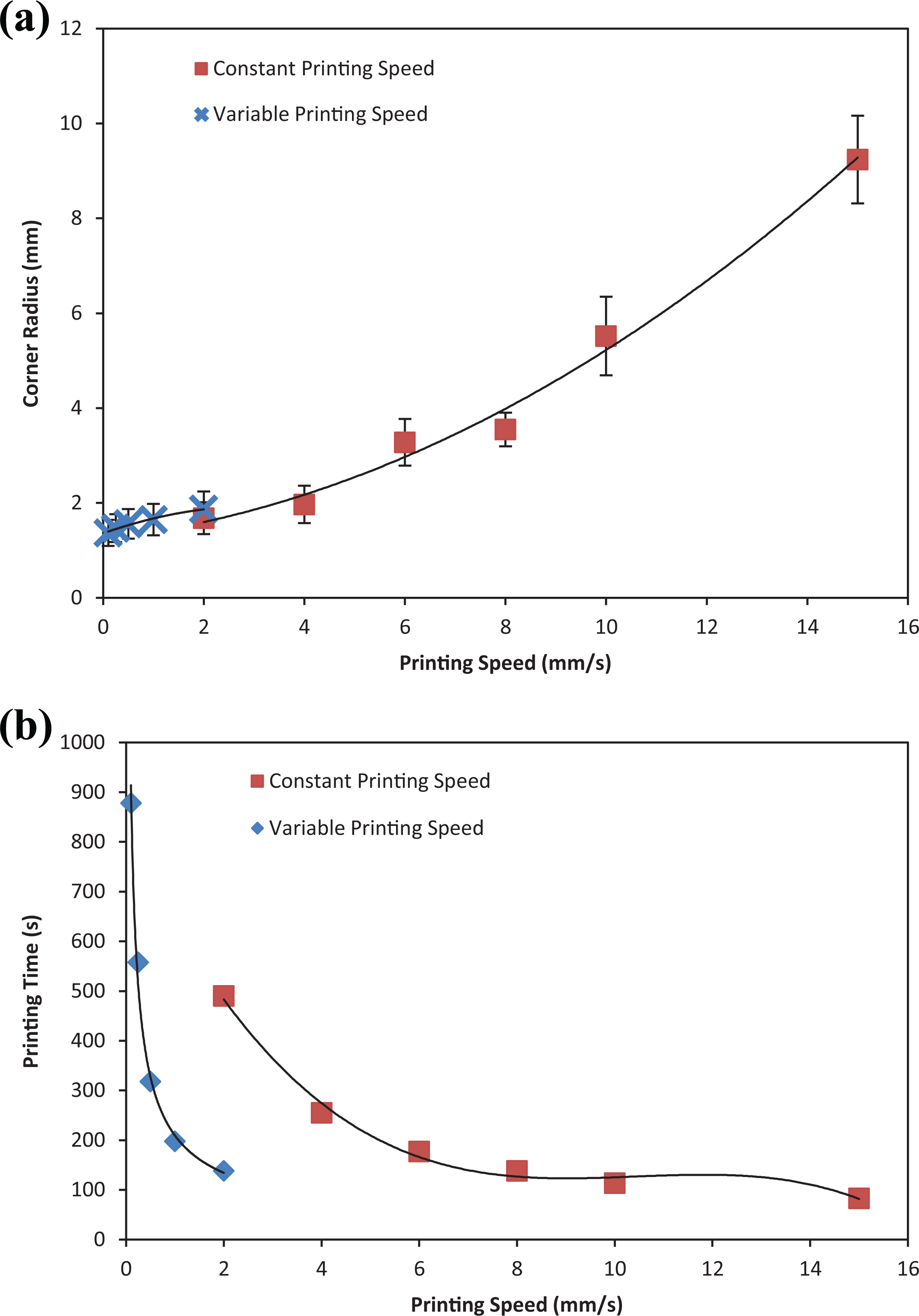 (a) Corner radius and (b) printing time variations according to printing speed.