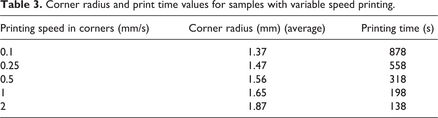 The printing speed in these samples is 15 mm/s (the maximum speed for printed samples) at direct paths, and 0.1, 0.25, 0.5, 1, and 2 mm/s are chosen for highlighted areas. Table 3 shows the mean radius vreated at the corners and the printing time of each sample for various printing speeds. The values are presented for the five samples and the mean results are reported.