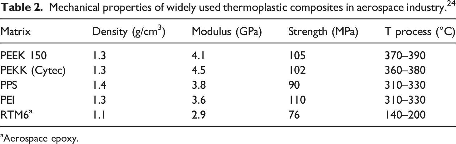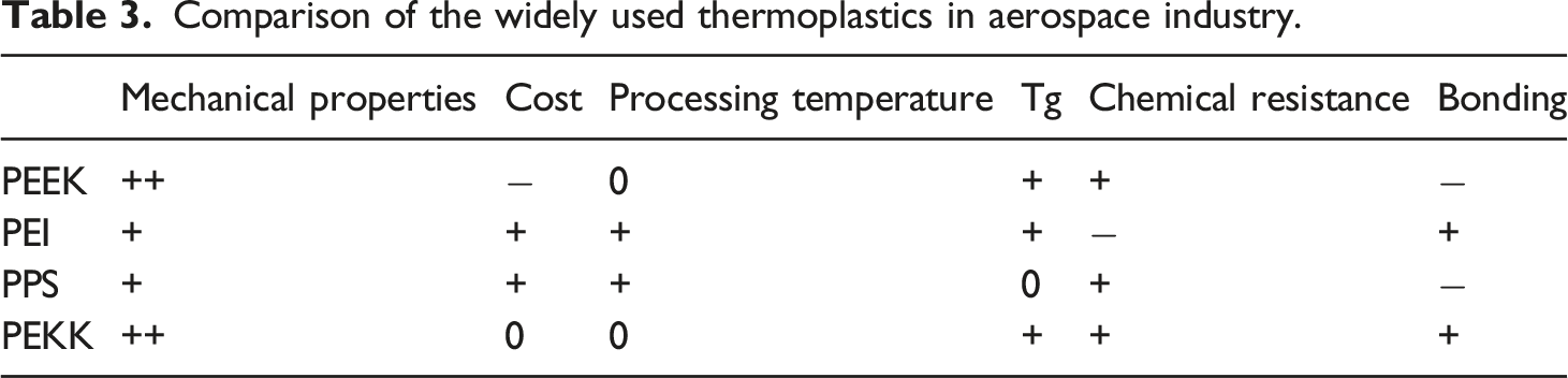 Table 3 compares high-performance thermoplastics widely used in the aerospace industry in terms of their mechanical properties, process temperatures, costs, glass transition temperatures (Tg), chemical resistance, and bonding capabilities. This table is composed based on previous studies and validated authors’ experience. “++” demonstrates the superiority of property over others, “+” highlights the advantage of the property while “0” means no impact on usage, and “−” indicates a lack of advantages.3,5