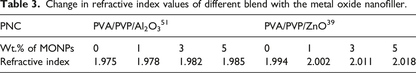 Change in refractive index values of different blend with the metal oxide nanofiller.