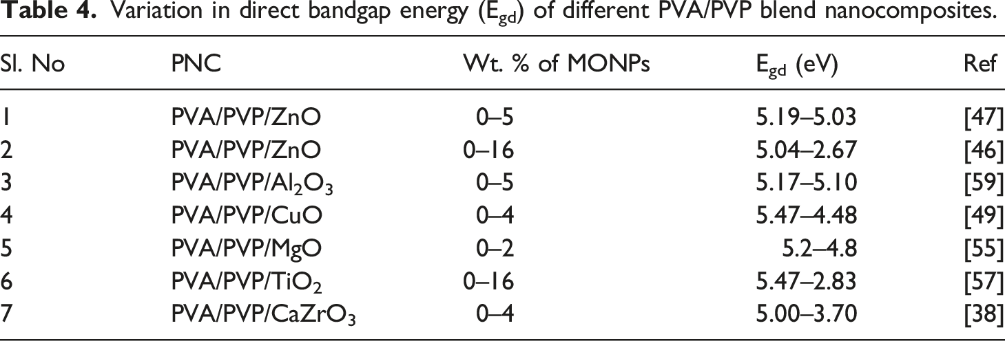 TiO2, a semiconductor with a wide bandgap of 3.2 eV is used as a nanofiller by Rajesh et al. 52 and Madhloom et al. 53 UV -Visible spectral investigations have shown that, with the rise in doping concentration, absorption bands observed around 200–300 nm for pure PVA/PVP shifts toward higher wavelengths with varying intensity. Madhloom et al 53 reported an absorption band at 360 nm for TiO2 in the UV spectrum of PVA/PVP/TiO2 PNCs. The intensity of these absorption bands increased as the particle size of TiO2 NPs increased from 15.7 to 45.7 nm, which can be attributed to the ability of TiO2 nanoparticles to absorb more incident light. Moreover, the Egd of nanocomposites is observed at 2.80 eV and 2.30 eV for particle sizes of 15.7 and 45.7 nm, respectively.
