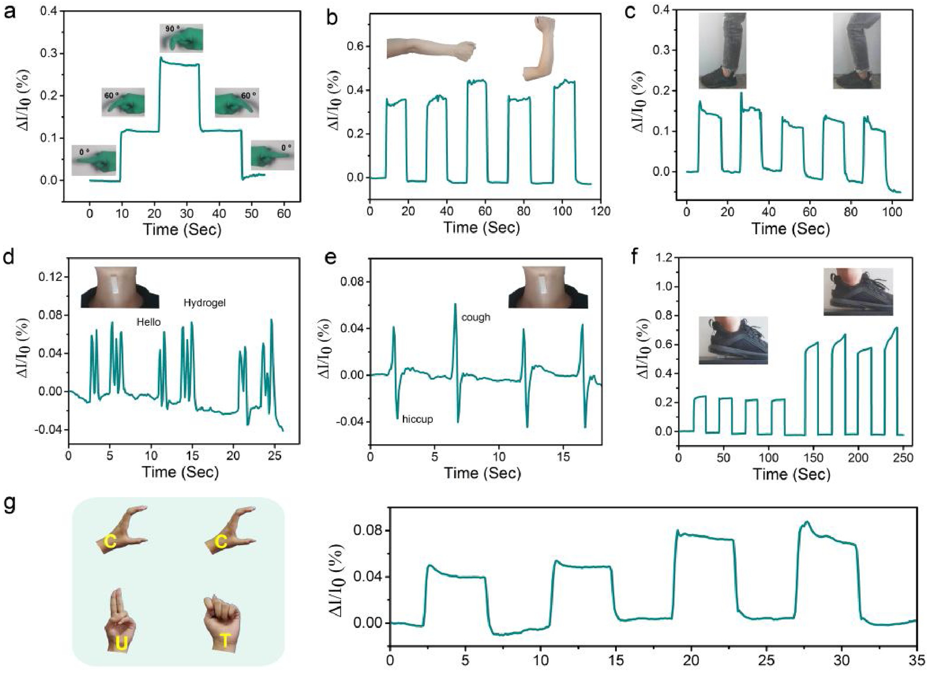 Tracking human body movements using SA gel-based sensors conducted across various body parts: a) Finger; b) arm; c) knee joint; d) throat; e) throat); f) walk; g) hand, 13 with permission from Elsevier (copyright 2020).