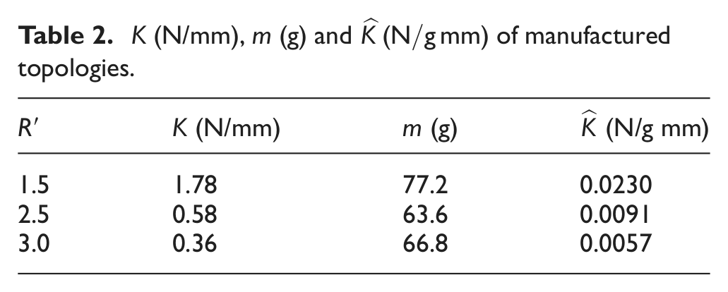 Using a polymer rather than a metal necessitated a lower load during testing, however, within the range tested, linear deformation was observed, enabling the results from the experimental testing to be compared with the FEA by scaling with the ratio of the modulus of the aluminium to that of the polymer. Comparison of the experimental deformation with that from a FE model of the corresponding smoothed topology yielded errors of less than 5%, thus confirming the accuracy of the analysis and manufacture. The most likely sources of the errors are variations in the density in the manufactured part and small differences in the assumed and experimental boundary conditions. A summary of the results from the experimental testing is presented in Table 2. It can be seen that the stiffness of the optimal structure, , increases with decreasing . This is in agreement with the trend seen in the TO studies, for example, see Figure 11, where is inversely proportional to stiffness. As mentioned previously, modifications to the geometry to enable manufacture resulted in changes in the volume fraction, and hence mass, of the structure, as shown in Table 2. Therefore, a fairer comparison of the performance of the structures can be made using a specific stiffness, , defined as the stiffness-to-mass ratio. From Table 2, it can be seen that also increases with decreasing , further validating the trends noted in the BESO parametric study.