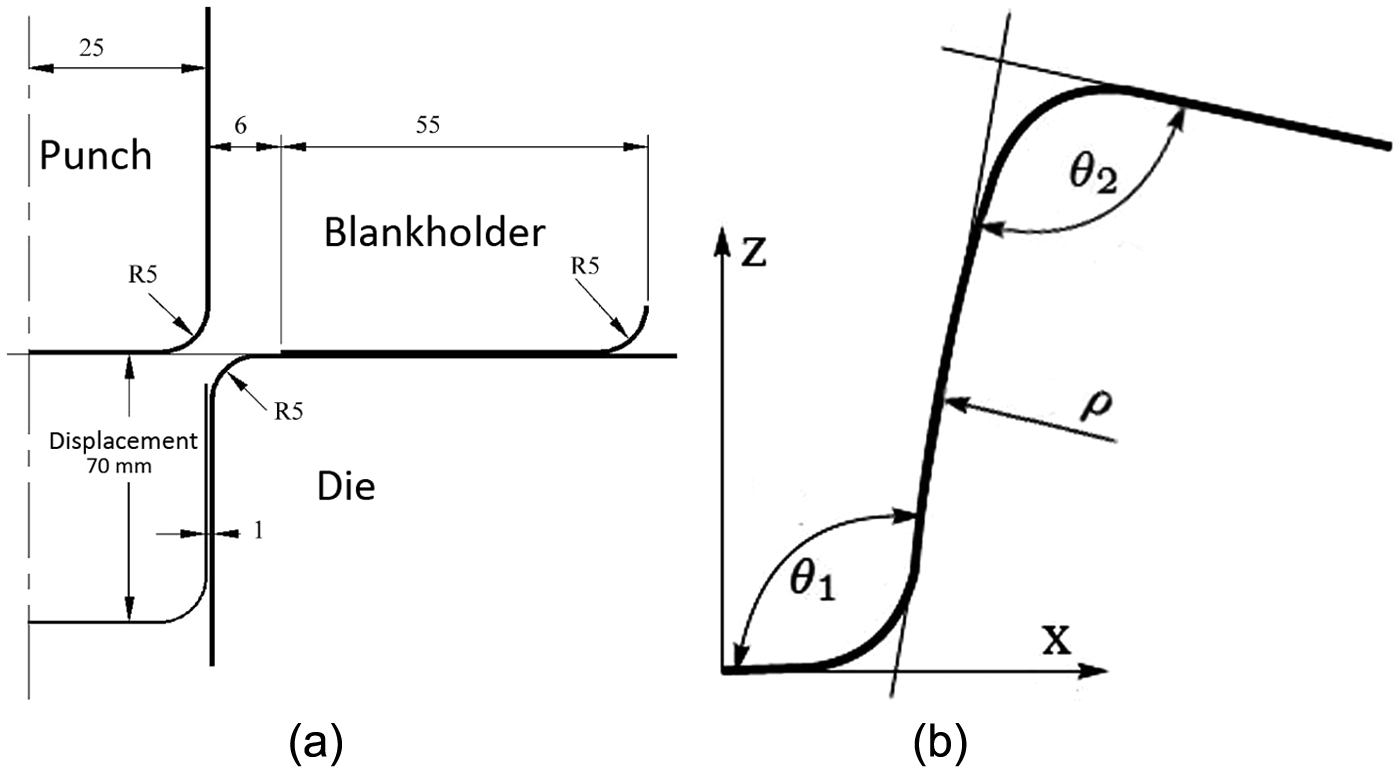 The simple U-bend test—benchmark problem from the NUMISHEET’93 conference—was employed to investigate the influence of process and tool parameters on springback (Figure 2(a)). The tool forms the sheet in a channel profile that is quite common in vehicle structural components and is very suitable to springback.