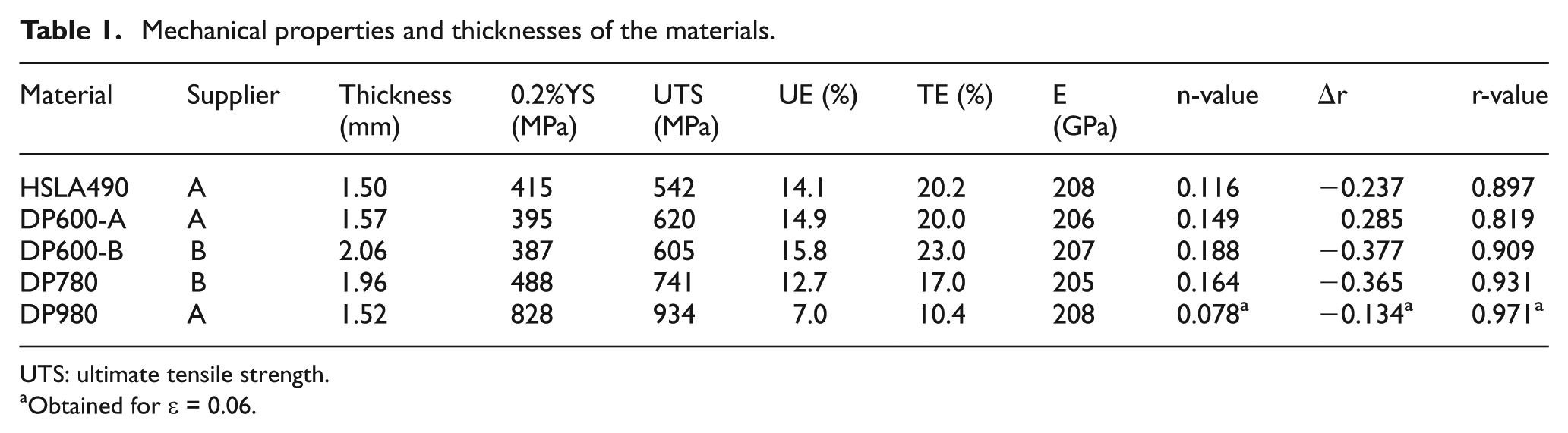 The materials selected for this study were steel sheets used in the automotive industry (Table 1). The sheet of high-strength low alloy (HSLA) has been used for many years in the production of automotive body structures. It is a typical conventional HSS obtained primarily by micro additions of micro-alloying elements primarily to control grain size. The selected AHSSs were four DP steels with a range of ultimate tensile strengths (UTSs) of 600, 780 and 980 MPa from two different suppliers (A and B) and thicknesses of 1.5 and 2 mm.