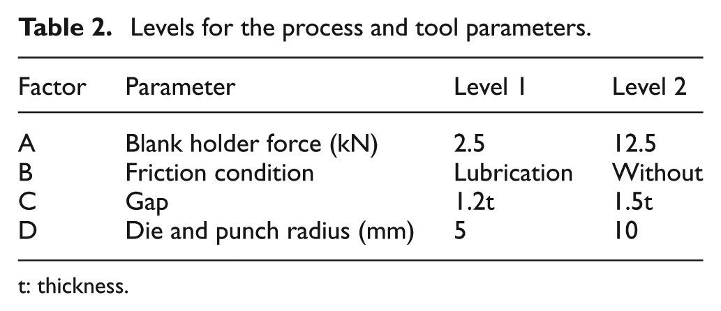 In order to study the influence of the process and tool parameters on the springback, a factorial design of 24 for each material was proposed. Table 2 shows the four parameters selected with two levels each.