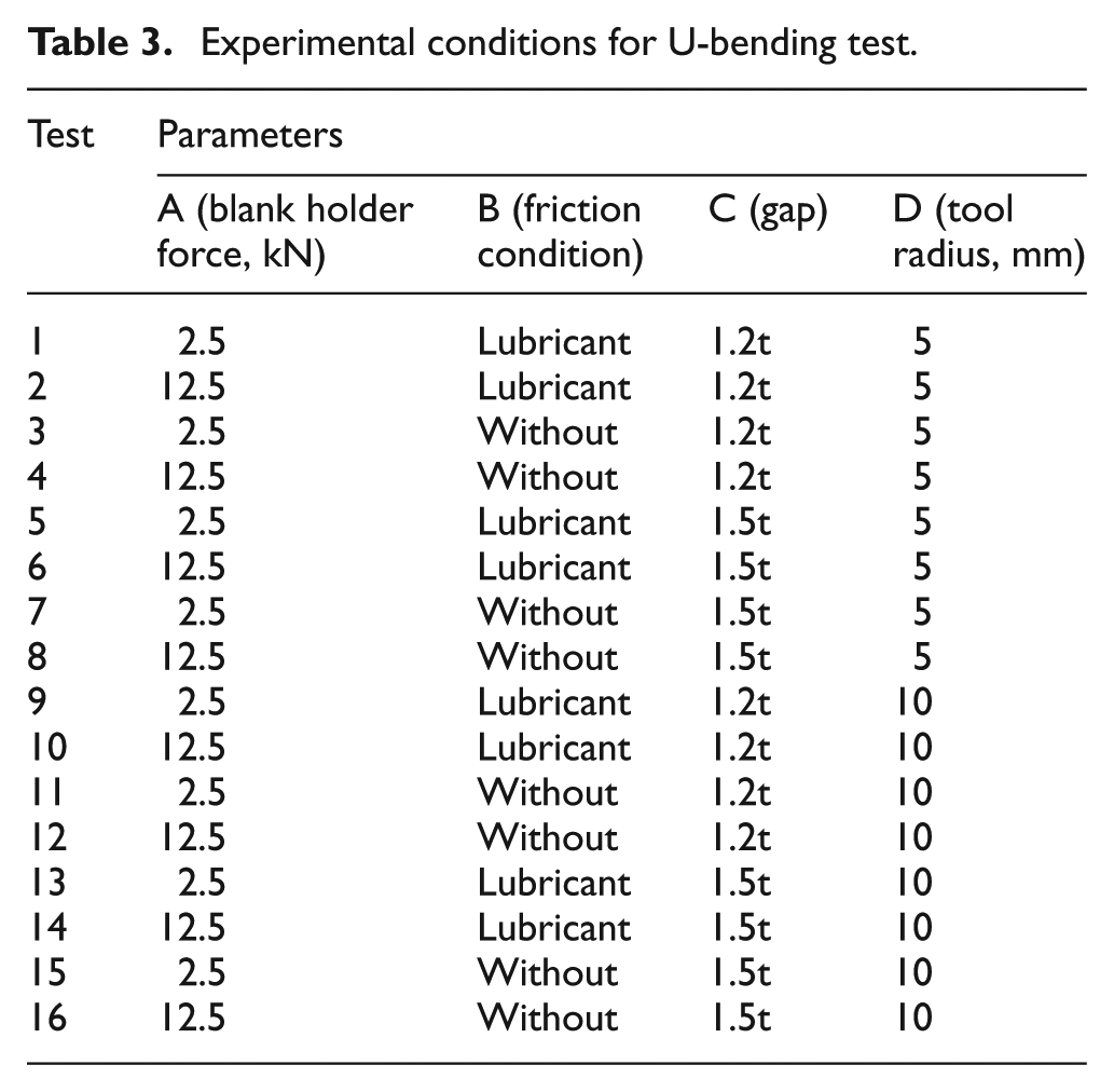 For level 1, a BHF of 2.5 kN is the default value proposed by Makinouchi et al. 5 After preliminary tests, the BHF value of 12.5 kN was set for level 2—maximum BHF before the rupture of the material. The friction condition was tested with and without lubrication, and the used lubricant was hydraulic automotive oil. The used gap was based from the work of Sadagopan and Urban, 14 and the radius of the tool (die and punch) of 5 mm is the default value of the U-bend benchmark tool. However, the sheet thickness used for the tests with this tool is typically 0.78 mm which results in a relative radius/thickness ratio of 6.5 mm (r/t). In order to maintain close relationship with the sheets of 1.5 and 2 mm used in this work, a radius of 10 mm was also defined (r/t of 6.6 mm for sheets of 1.5 mm). Table 3 shows the 16 arrangements of the parameters that were used—as proposed by the 24 factorial design.