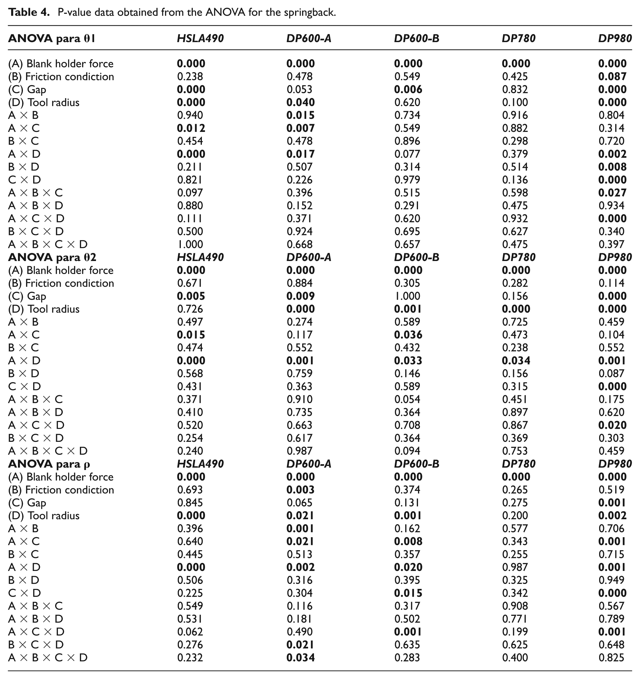According to ANOVA, the BHF, gap and tool radius were parameters that had significant influence on the springback (Table 4). It should be noted that, for a correct interpretation of statistical results cannot be considered the main effect of a factor when it is involved in an interaction also significant. For this reason, all significant interactions on the springback—θ1, θ2 and ρ—were cross-analyzed. However, because of the large amount of generated data, only the most significant data are illustrated in Table 4.