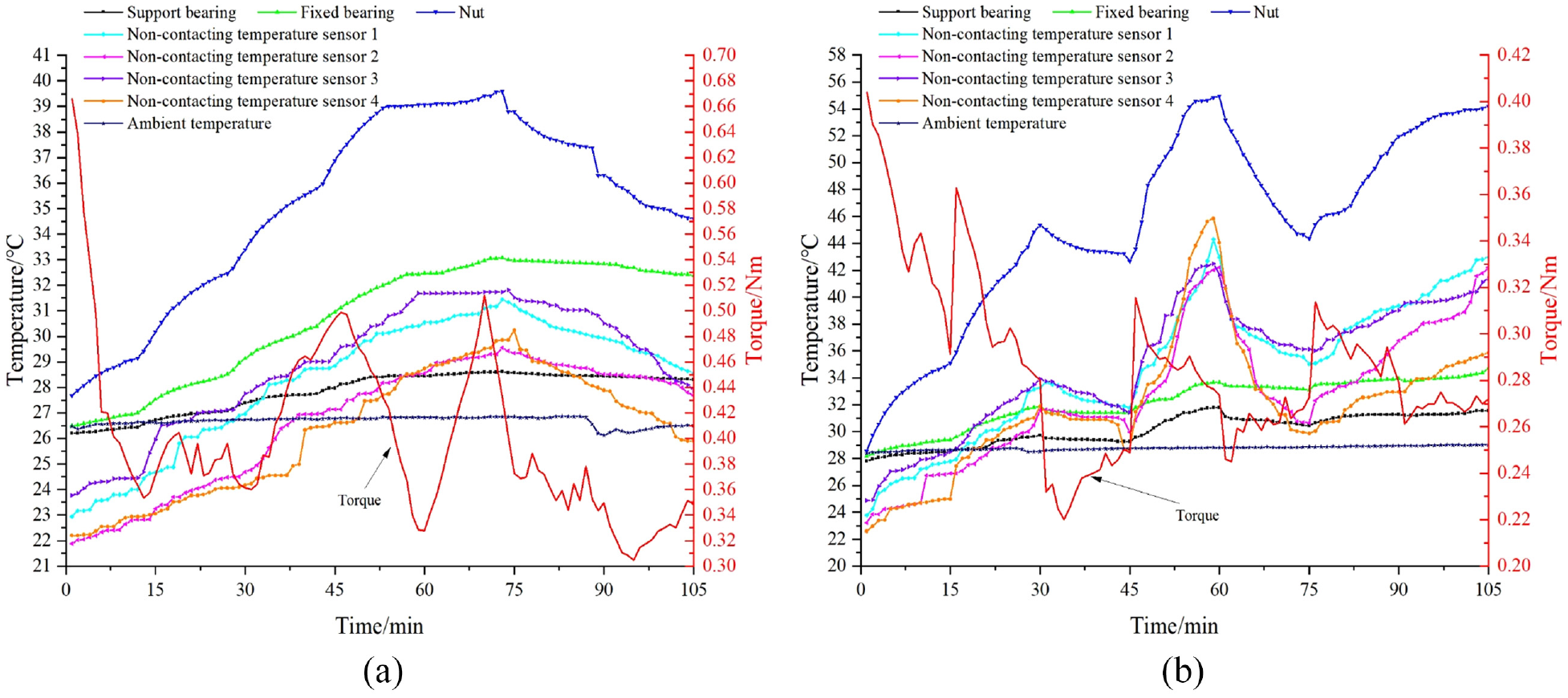 Firstly, to ensure the experiments goes well, the pretests were conducted on the test bench. And the step speed thermal characteristic experiment was carried out to validate the XGBoost prediction model. The rotation speed increased from 600 to 2400 rpm, then decreased to 600 rpm. The real-time temperature information was collected and visualized during the operation by a thermal error experimental temperature measurement system. The sample interval was set to 1 min. Subsequently, a random speed thermal characteristic experiment was conducted at the same condition, and the temperature and torque data were obtained.