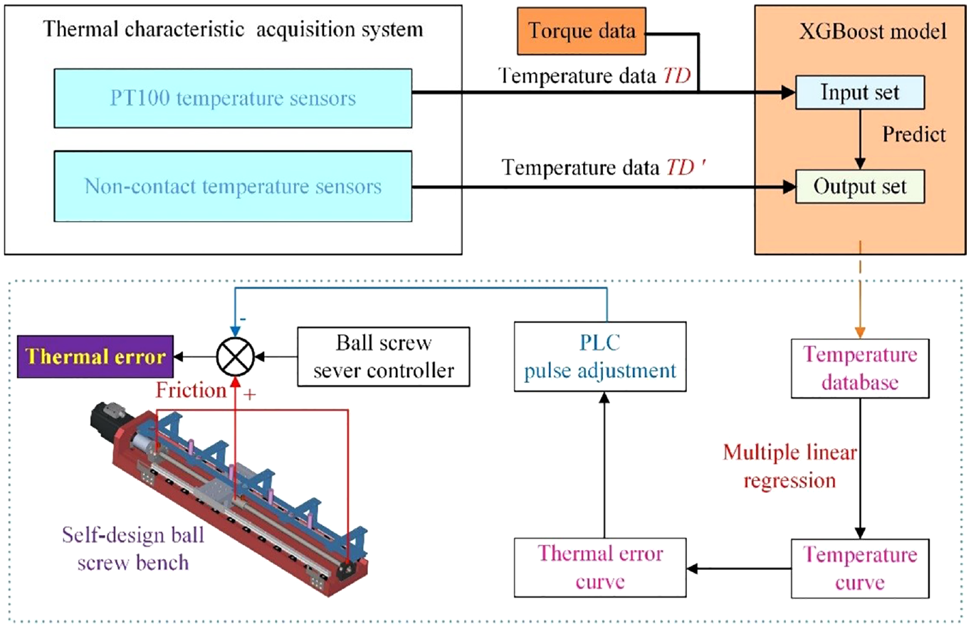 In this research, a thermal error compensation method is proposed and validated to deal with a decrease in the positioning accuracy of the ball screw. Since the axial positioning accuracy of machine tools is mainly affected by ball screw feed driving systems, errors in other directions are guaranteed by the guide slide, and thermal deformation in other directions is out of the scope of this research. Firstly, the temperature predictive model of key points on the ball screw is established using the XGBoost algorithm. Then, the prediction performance between the XGBoost algorithm and the backpropagation (BP) neural network is compared to the data collected from thermal characteristics experiments. Furthermore, the thermal error values are obtained using the multiple linear regression method and thermal expansion principle. These values can compensate for the position error by adjusting the sever pulses. Finally, the thermal error compensation experiments are conducted, and the effectiveness and robustness of the proposed method are validated. The framework of the research work is shown in Figure 1.