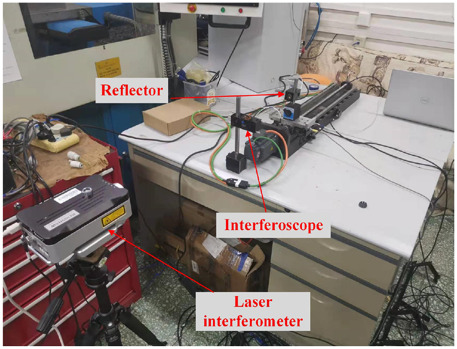 Thermal error compensation experiments were conducted on the self-design ball screw bench to validate the improvement in the positioning accuracy of the ball screw feed system by the proposed method. The thermal error compensation system includes thermal characteristics acquisition, temperature prediction, and a thermal error compensation module. The temperature prediction module was used to predict the temperature of four key points on the screw based on the model established in Section 2. Then, the temperature data was transferred into thermal error data on every point of the screw, which was assigned as the compensation value in the thermal error compensation module. After removing the non-contacting temperature sensors and their bracket, the other experimental set was the same as in Section 2.2. In addition, the laser interferometer (XL-80, Renishaw) was selected to measure the positioning accuracy of the work table. The experimental setup is shown in Figure 8.
