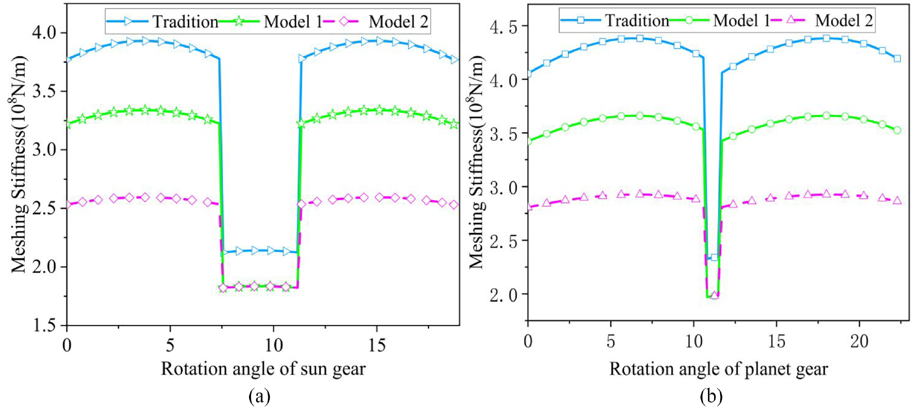 The traditional model does not consider the contact stiffness and the coupling effect between teeth under nonlinear loads. Model 1 considers the contact stiffness under nonlinear load, and Model 2 considers the contact stiffness and the coupling effect between teeth under nonlinear load.