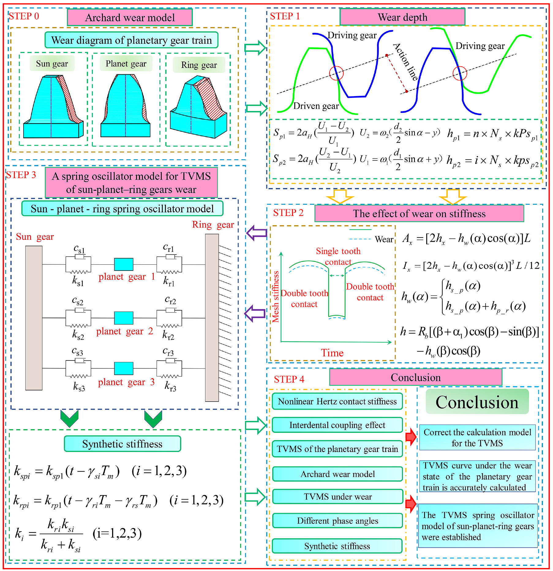 At the same time, we established the spring oscillator model of the TVMS of the sun-planet-ring gears. The synthetic stiffness under the wear state is calculated and analyzed. The research on the spring oscillator model of the meshing stiffness is of great significance for studying the vibration response caused by stiffness excitation in the two-stage planetary gear train, which is the theoretical basis for faults coupling dynamics of multistage planetary gear train.