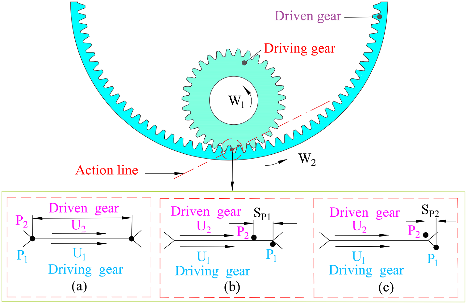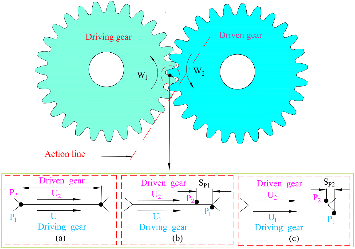 There are three different positional relationships between the active gear and the driven gear shown in Figure 12. The displacement of two meshing positions is 2